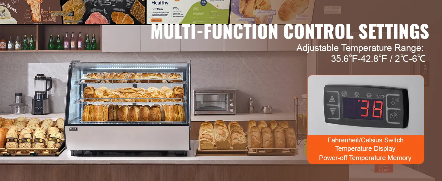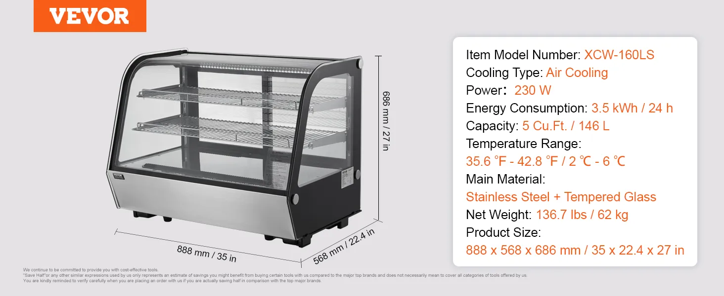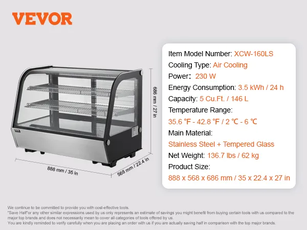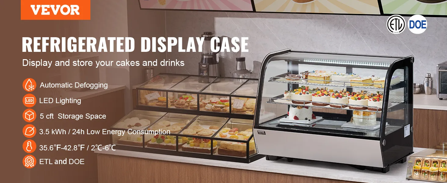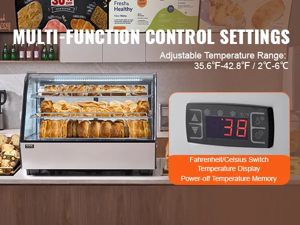 Snelle koeling: de koelvitrine heeft een koelsysteem met turboventilator, dat snel kan afkoelen tot de ingestelde temperatuur (temperatuurbereik: 35,6-42,8 °F / 2-6 °C) en de interne temperatuur binnen het opgegeven bereik houdt. Hij is energiezuinig en verbruikt slechts 3,78 kWh/24 uur, waardoor uw voedsel in optimale staat blijft.