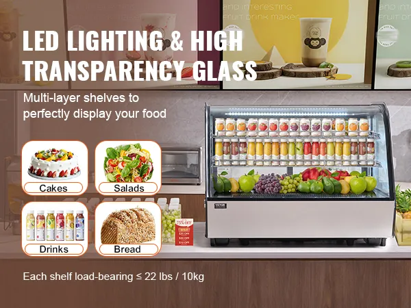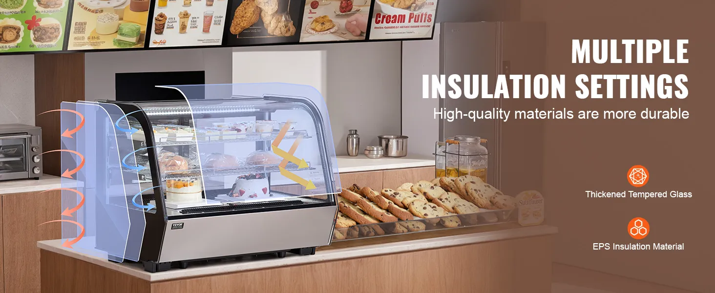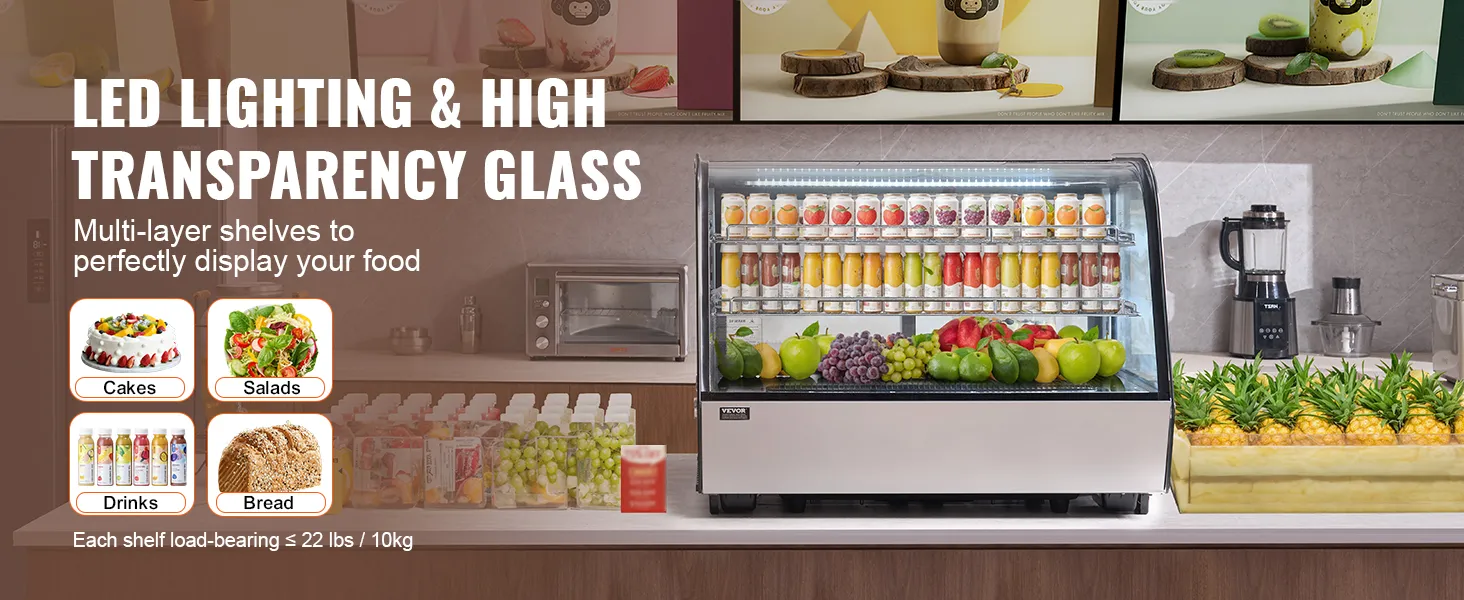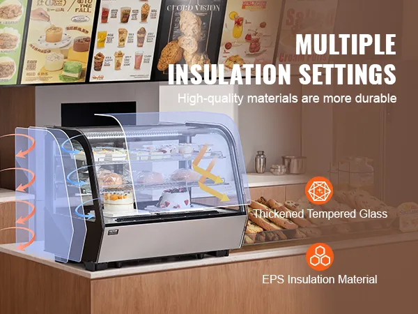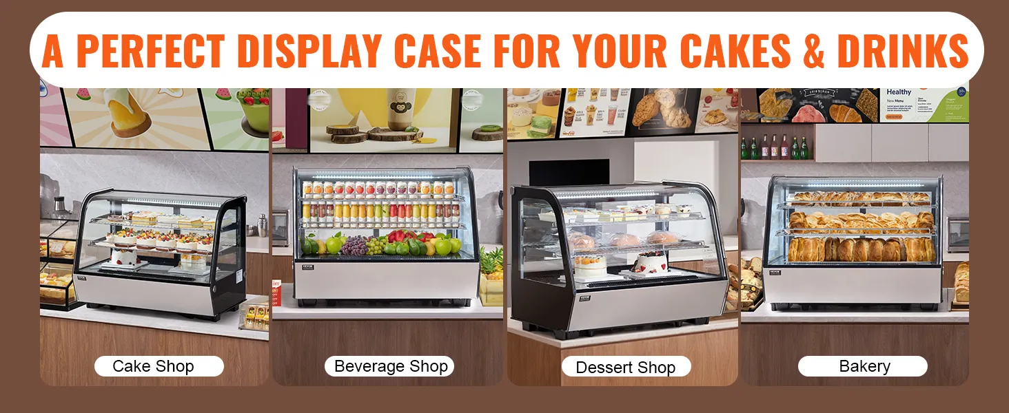Toonbankvitrine: het gestroomlijnde ontwerp past gemakkelijk in verschillende hoeken, waardoor het perfect is voor gebruik in bakkerijen, banketbakkers, drankenmarkten en dessertwinkels.