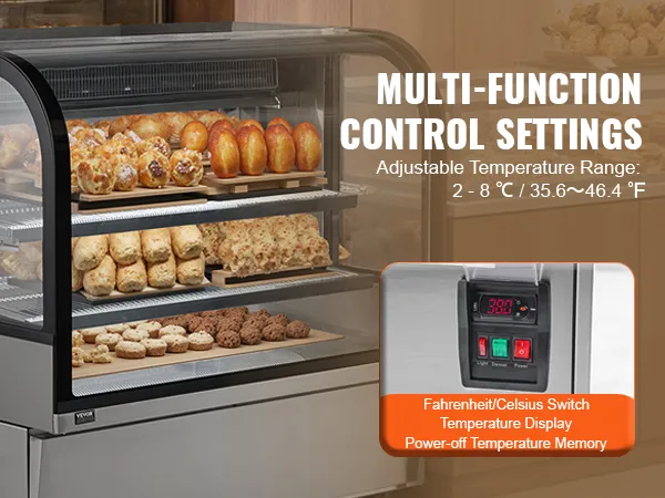The 2 adjustable shelves allow for flexible placement of items at different heights. The LED lights and high-transparency tempered glass enhance the appeal of the food, increasing the likelihood of customer purchases.