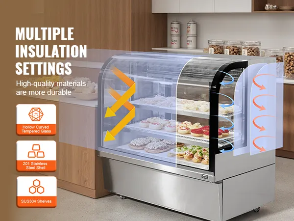 Quick Cooling: The refrigerated display case features a recessed direct cooling system that rapidly cools to the set temperature (temperature range: 2 - 8°C / 35.6 - 46.4°F). It efficiently keeps the internal temperature within the designated range, ensuring your food stays in the best condition while saving energy.