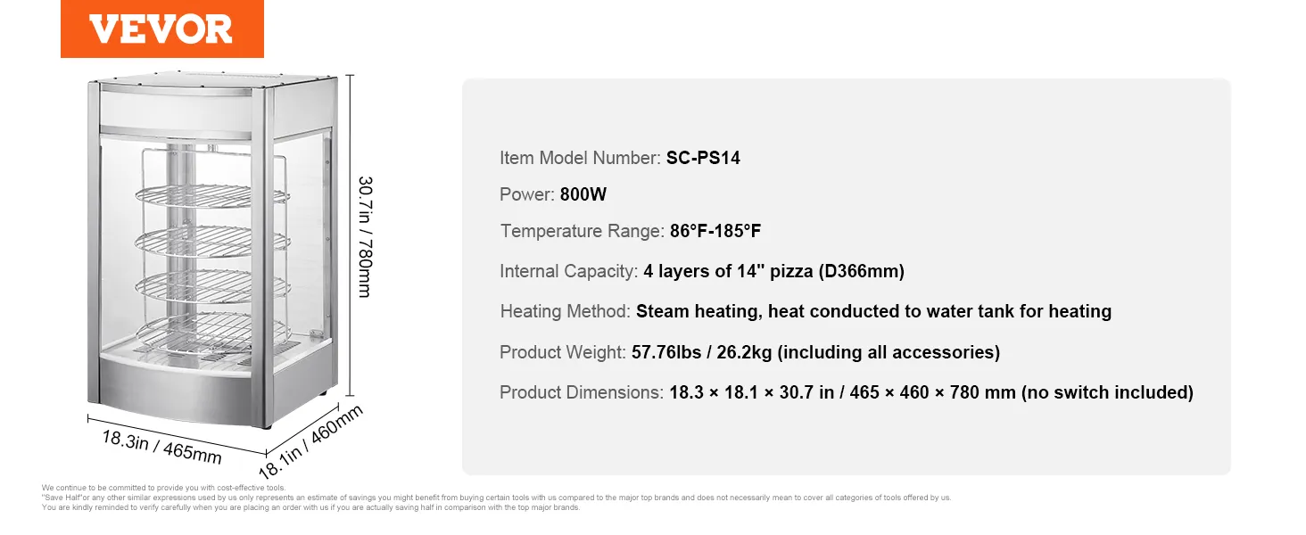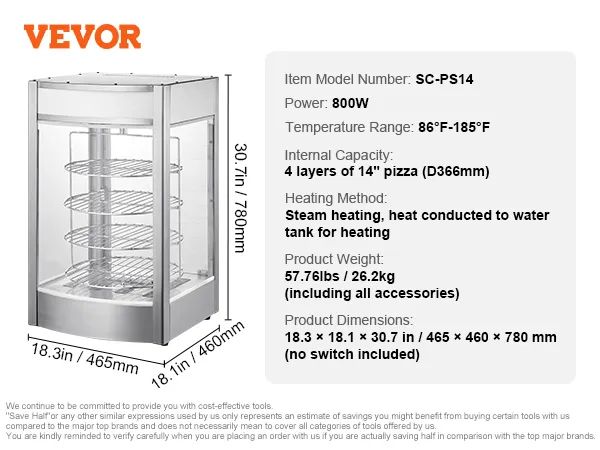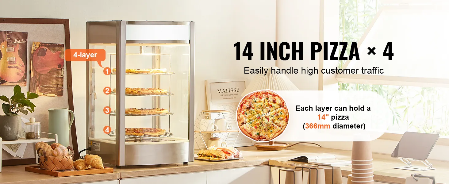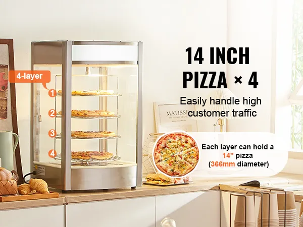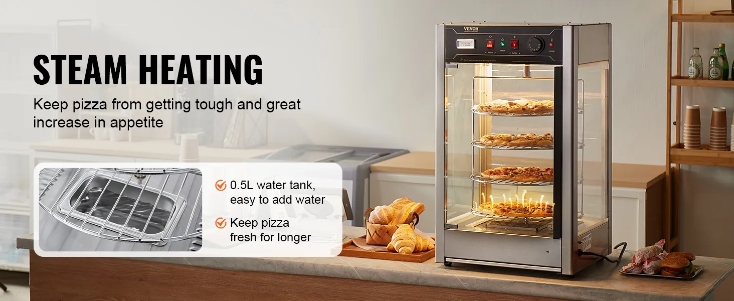 VEVOR Commerciële Voedselverwarmer voor 14-inch Pizza, 4-laags Pizzaverwarmer met Roterende Stoomverwarming, 30℃~85℃ Temperatuurregeling en Temperatuurweergave, 25W Ovenlamp + Top LED voor Pizzeria, Restaurant