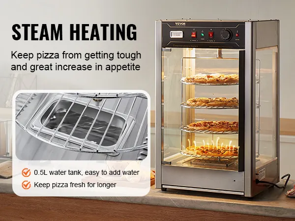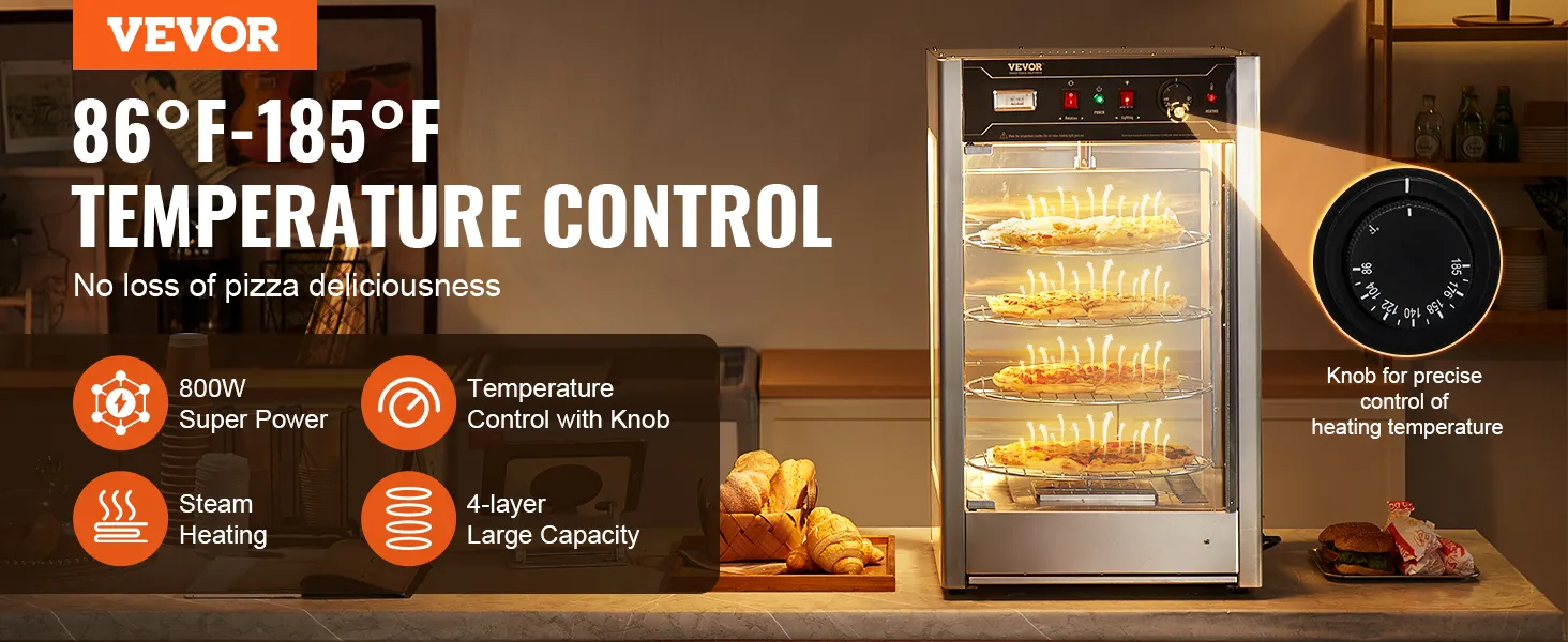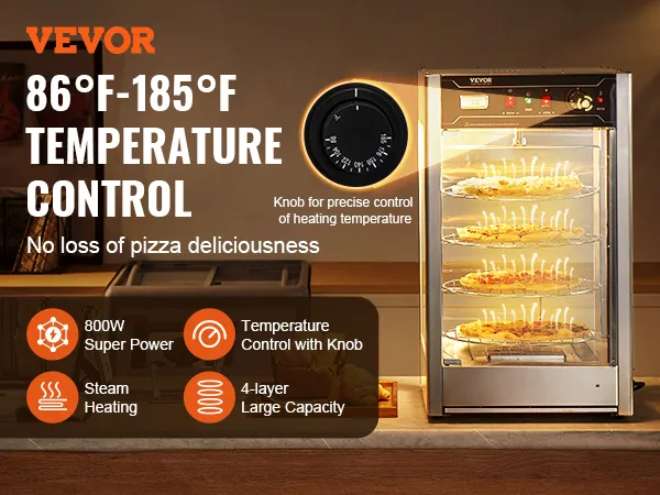 Temperatuurregeling met knop: Bang dat uw pizza koud wordt? Onze pizzawarmer maakt gebruik van interne stoomverwarming om ervoor te zorgen dat uw pizza warm blijft. Met een breed temperatuurbereik van 30-85℃ (86 tot 185℉) bewaar je diverse levensmiddelen altijd op de optimale temperatuur. De bediening is eenvoudig met een temperatuurregelknop en een temperatuurdisplay aan de buitenkant van de verwarmer, zodat u de temperatuur in realtime kunt volgen om een nauwkeurigere verwarming te garanderen.