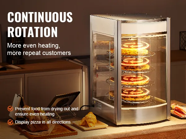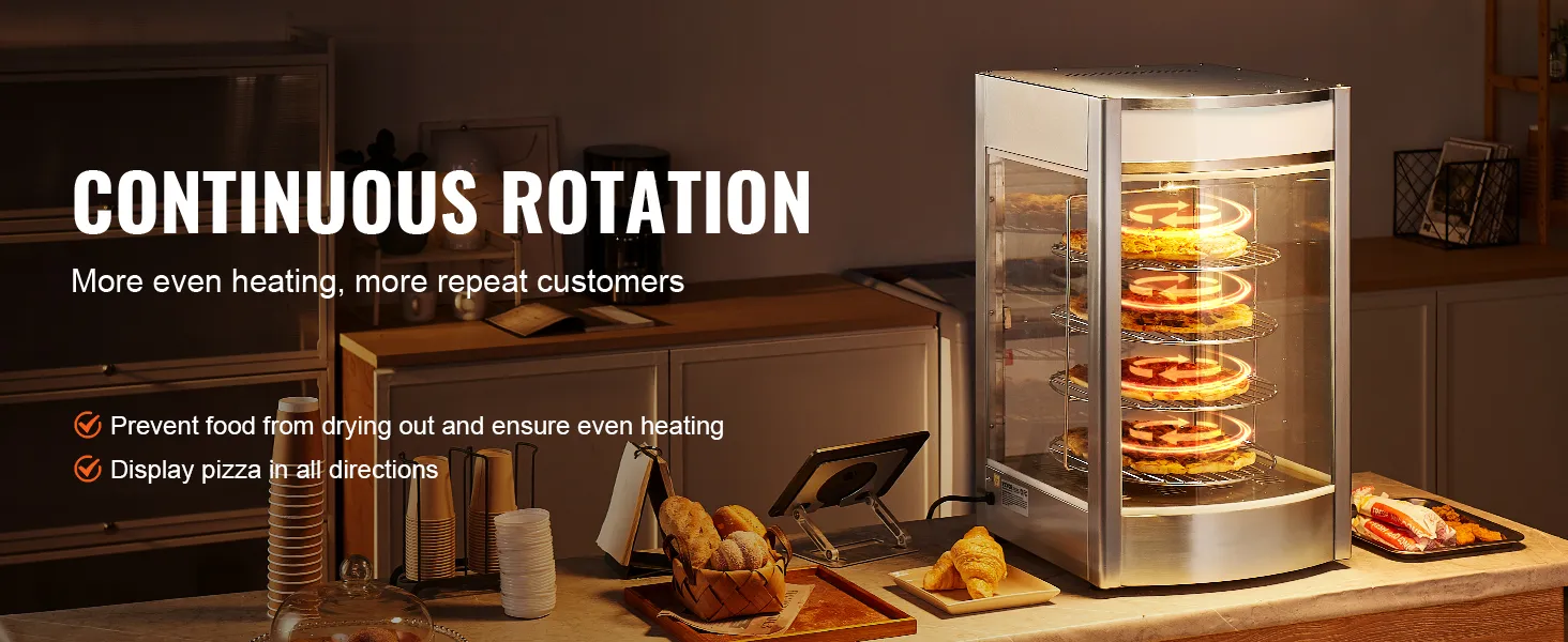 Circulerende rotatie: het unieke circulerende rotatieontwerp zorgt voor een gelijkmatige verwarming en levert bij elke hap een warme en knapperige pizza. De lamp van 25 watt in combinatie met het draaibare display zorgt voor een uitstekende presentatie van het eten.