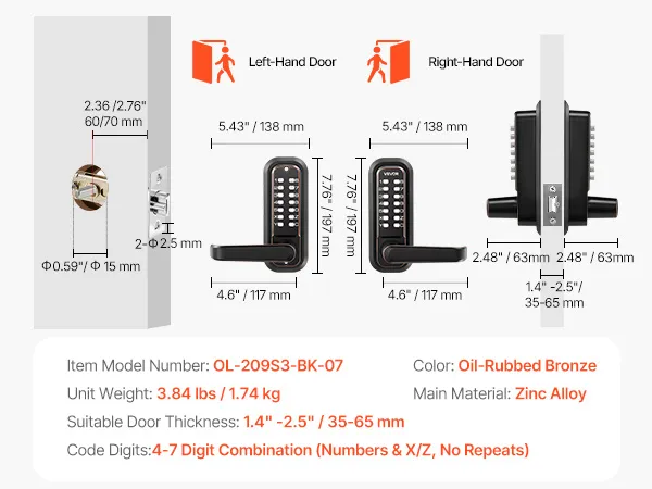VEVOR Mechanisch Codeslot met Dubbelzijdig Toetsenbord (4- tot 7-cijferige code), Sleutelloos Deurslot met Handgreep & Automatische Vergrendeling, voor Voordeuren en Garages, Oliebronskleurige Afwerking