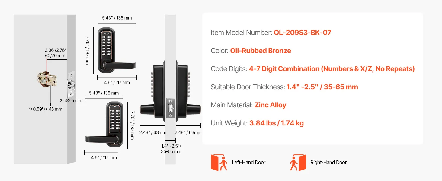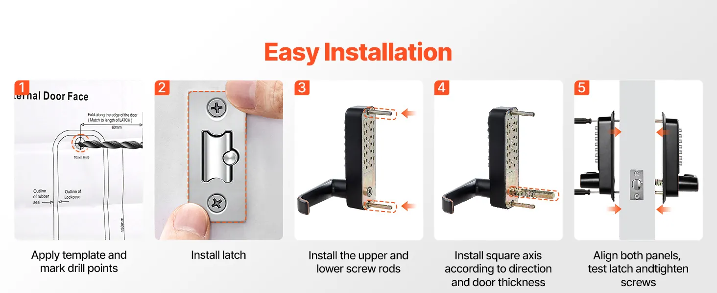 Dit mechanische, sleutelloze deurslot is geschikt voor metalen poorten, houten deuren en diverse standaard deurdiktes. Het wordt geleverd met meerdere assen en schroeven voor verschillende montagemogelijkheden.