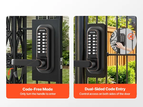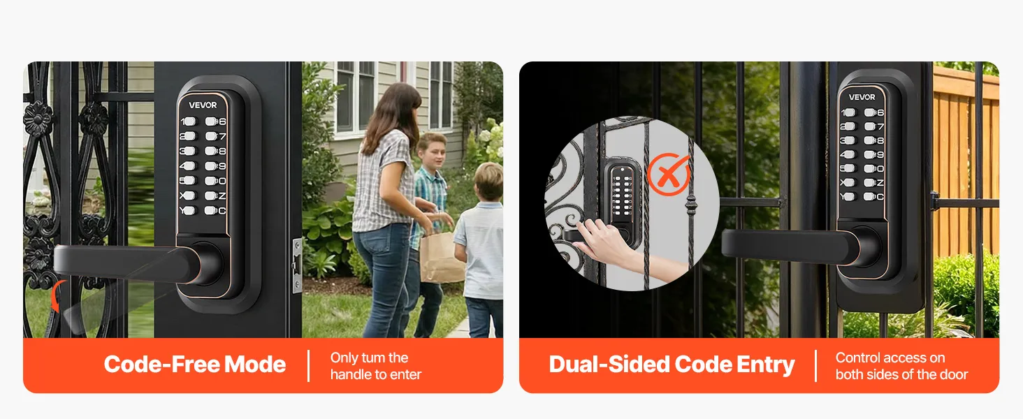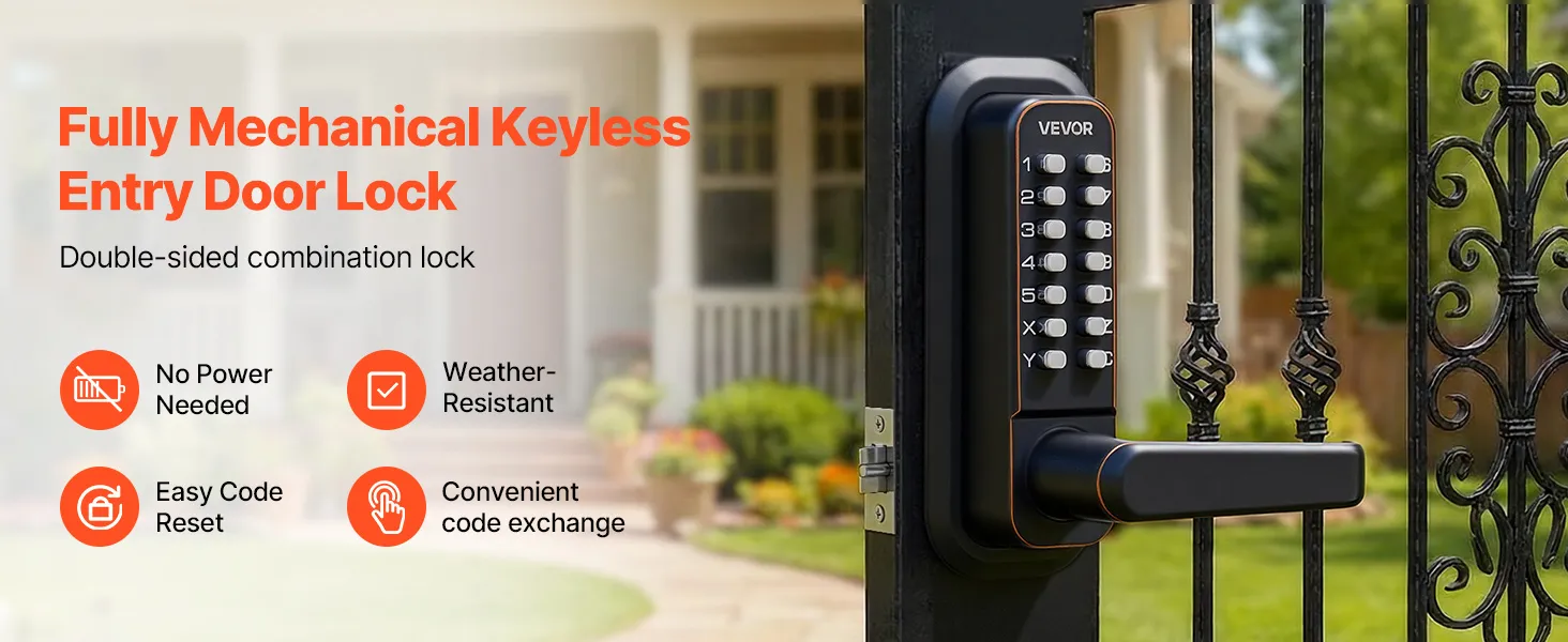 Verbeterd mechanisch deurslot 2.0: Wijzig uw code direct via de deurklink en het toetsenpaneel zonder het slot te verwijderen. Ontgrendel met een simpele mechanische code – geen elektronica nodig – en wis de toegang met de C-knop voor snelle correcties.