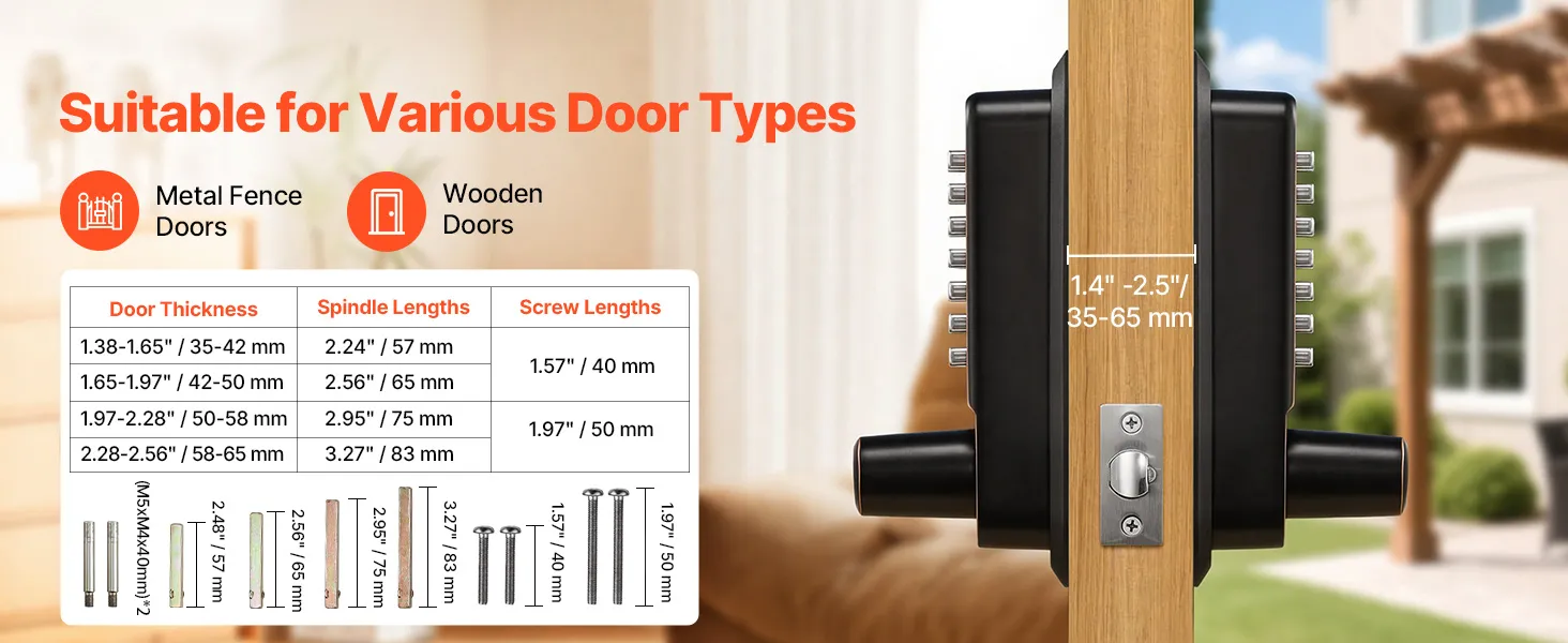 Geschikt voor diverse deurtypen: Dit mechanische, sleutelloze deurslot wordt geleverd met vier vierkante spindels (voor deurdiktes van 35-65 mm) en twee boutmaten (6 cm en 7 cm) voor verschillende deurdiktes. Het slot kan zowel op links- als rechtsdraaiende deuren worden gemonteerd.