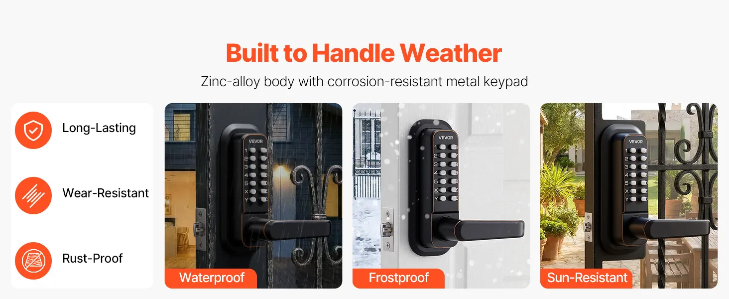 Ontworpen voor dagelijks gebruik: Dankzij de robuuste behuizing van zinklegering met een roestwerende coating is dit mechanische deurslot met toetsenpaneel bestand tegen regen en zon en is het bestand tegen veelvuldig gebruik. Het is ideaal voor voordeuren, tuinpoorten, garages en alle binnen- en buiteningangen.
