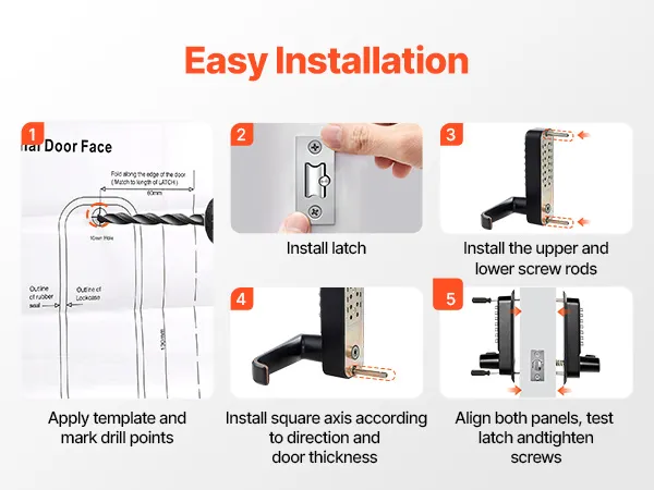 Er is geen elektrische bedrading of ingewikkelde instellingen nodig. Ons mechanische deurslot met toetsenbord past op de meeste standaard deuren en kan door niet-professionals worden geïnstalleerd, wat tijd en moeite bespaart.