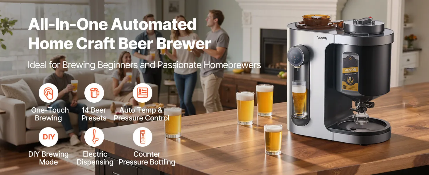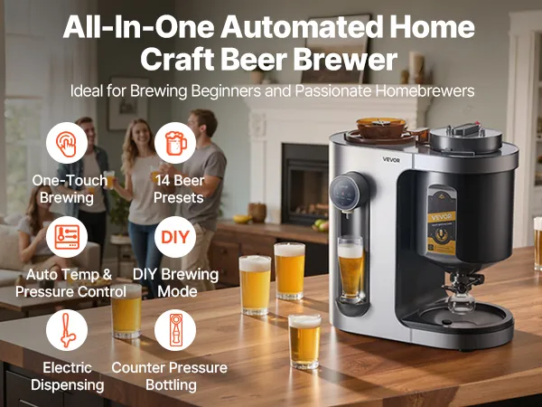 Brew beer easily at home with this all-in-one machine. Fully automatic from mashing to bottling, one-touch start, and clear LCD guidance. 14 built-in recipes plus DIY mode for custom flavors—ideal for beginners and craft beer lovers.