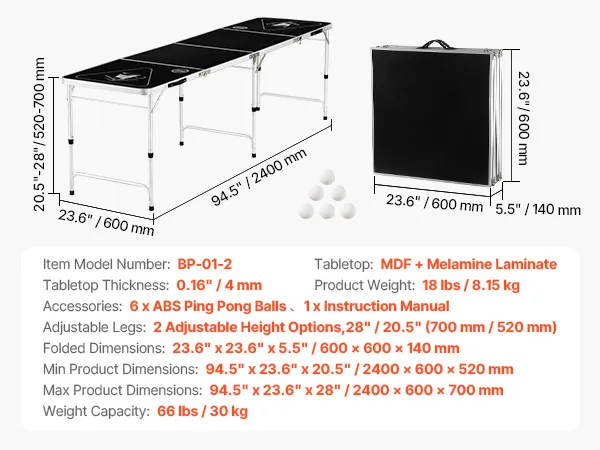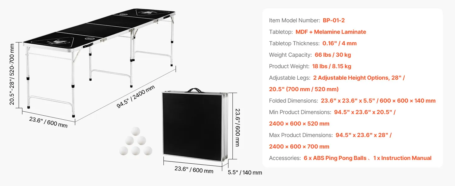 This beer pong table features two adjustable height settings of 20.5 inches and 28 inches, allowing players to flexibly adjust it according to their height and preference, ensuring a comfortable and personalized playing experience for everyone.