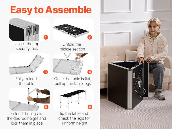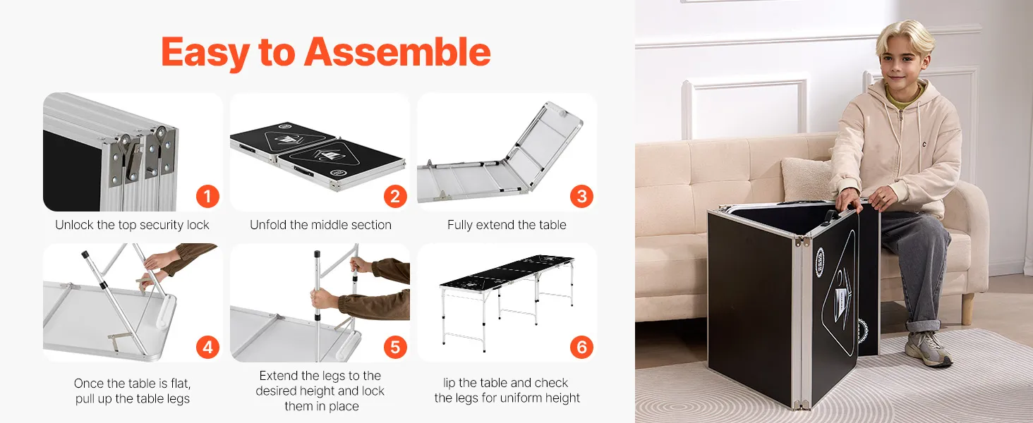 Multifunctional Design: This foldable beer pong table features a multi-functional design, combining a sturdy aluminum frame with a durable MDF tabletop to ensure stability and reliability. Equipped with a security locking mechanism and adjustable height, it offers secure gameplay while accommodating players of different shapes.