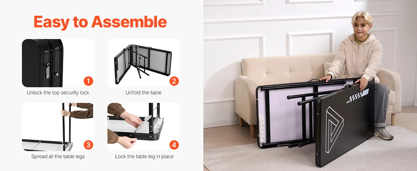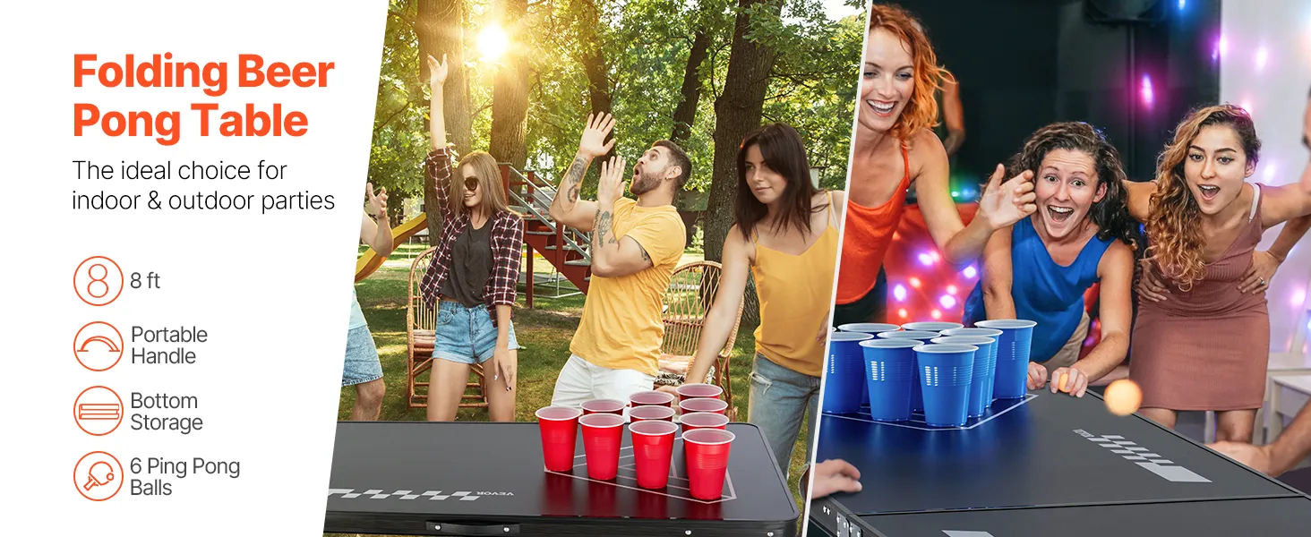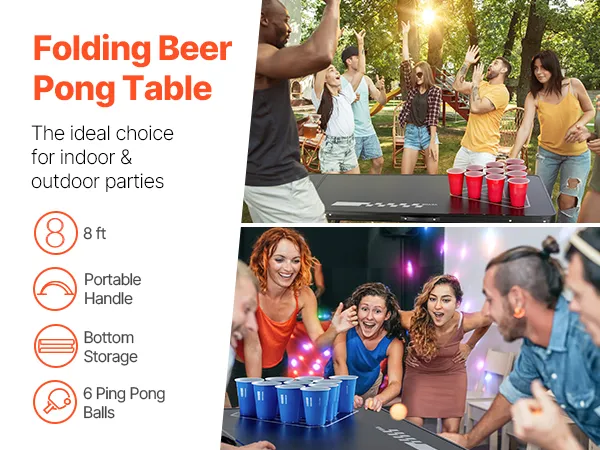 VEVOR 8 Foot Portable Beer Pong Table, Foldable 36 inch Heightened Table,  Carrying Handles and 6 Pong Balls, Lightweight Tailgate Table for Office, Tailgate Party, Travel & Camping, Black VEVOR 8 Foot Portable Beer Pong Table, Foldable 36 inch Heightened Table,  Carrying Handles and 6 Pong Balls, Lightweight Tailgate Table for Office, Tailgate Party, Travel & Camping, Black