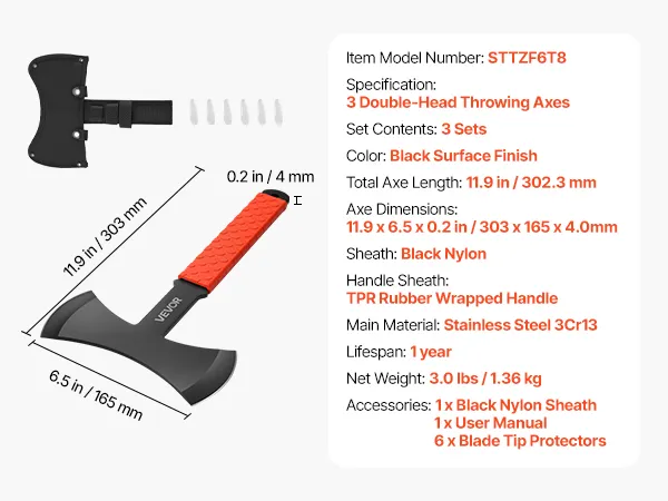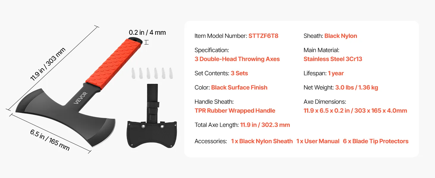 VEVOR Werpende Bijlen en Tomahawks Set van 3 stuks 302,3 mm Dubbelzijdige Bijl Werpende Bijlset met Roestvrijstalen Kop & Antislip TPR Rubberen Handvat & Zwarte Nylon Hoes, voor Recreatieve Wedstrijd Kampeeraccessoires
