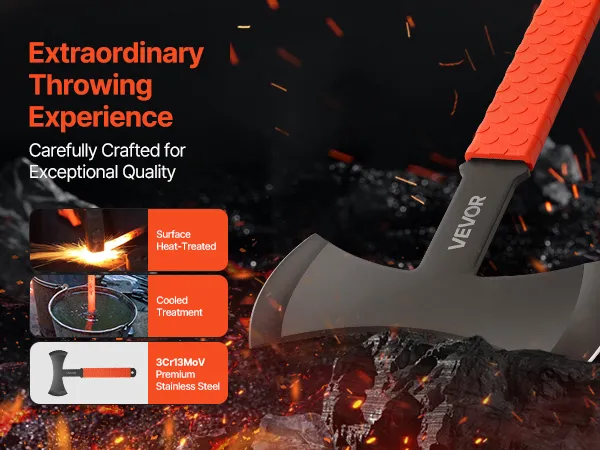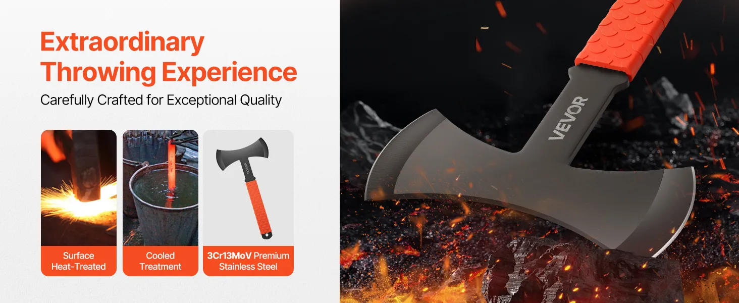 Robuust en duurzaam staal: deze werpbijlset is gemaakt van hoogwaardig 3Cr13 roestvrij staal met een warmtebehandeld of zwart oppervlak en is bestand tegen slijtage en roest voor langdurig buitenplezier.