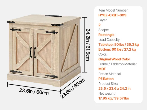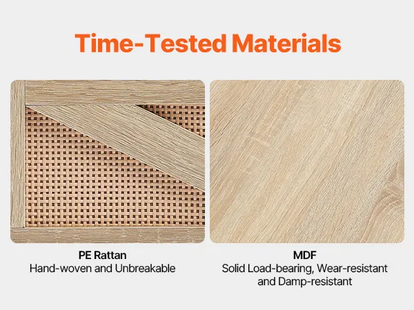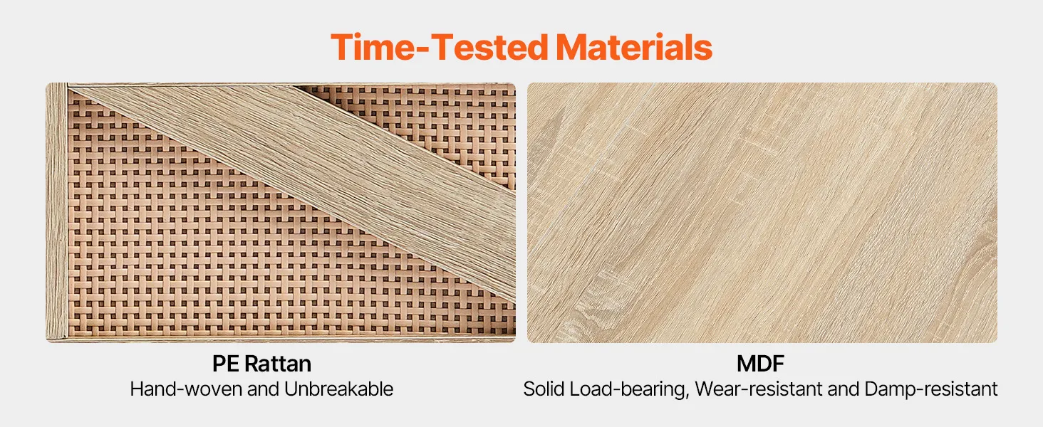 This wood coffee table is constructed from medium-density fiberboard and durable PE rattan. It offers a weight capacity of 80 lbs (36.3 kg) for the tabletop and 60 lbs (27.2 kg) for the lower layer, ensuring strength for everyday use.