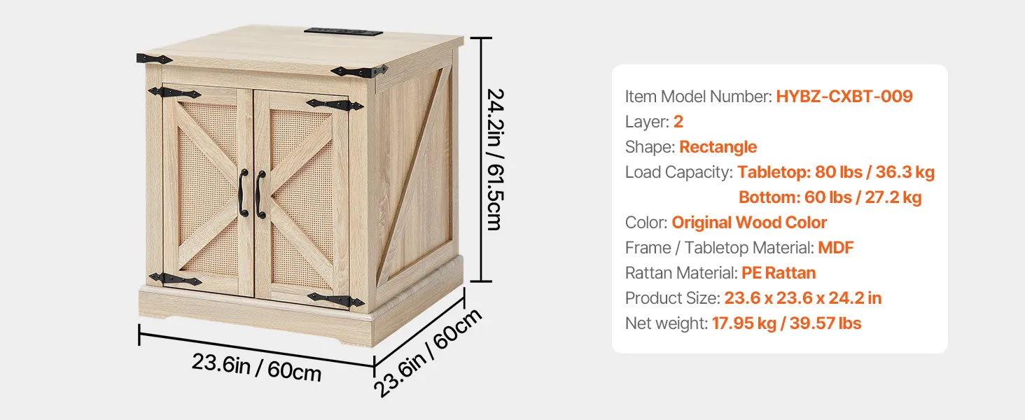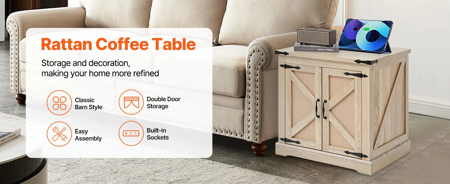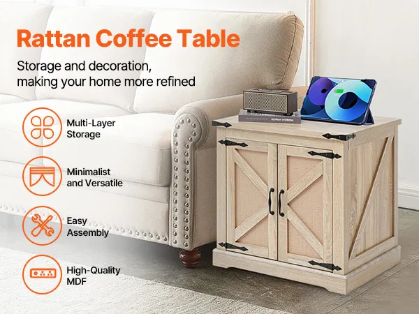VEVOR Farmhouse End Table, Rectangle PE Rattan Woven Wood Coffee Table, 24-Inch Modern Boho Style Storage Coffee Table with Retro Metal Hinges, for Living Room, Bedroom & Small Spaces