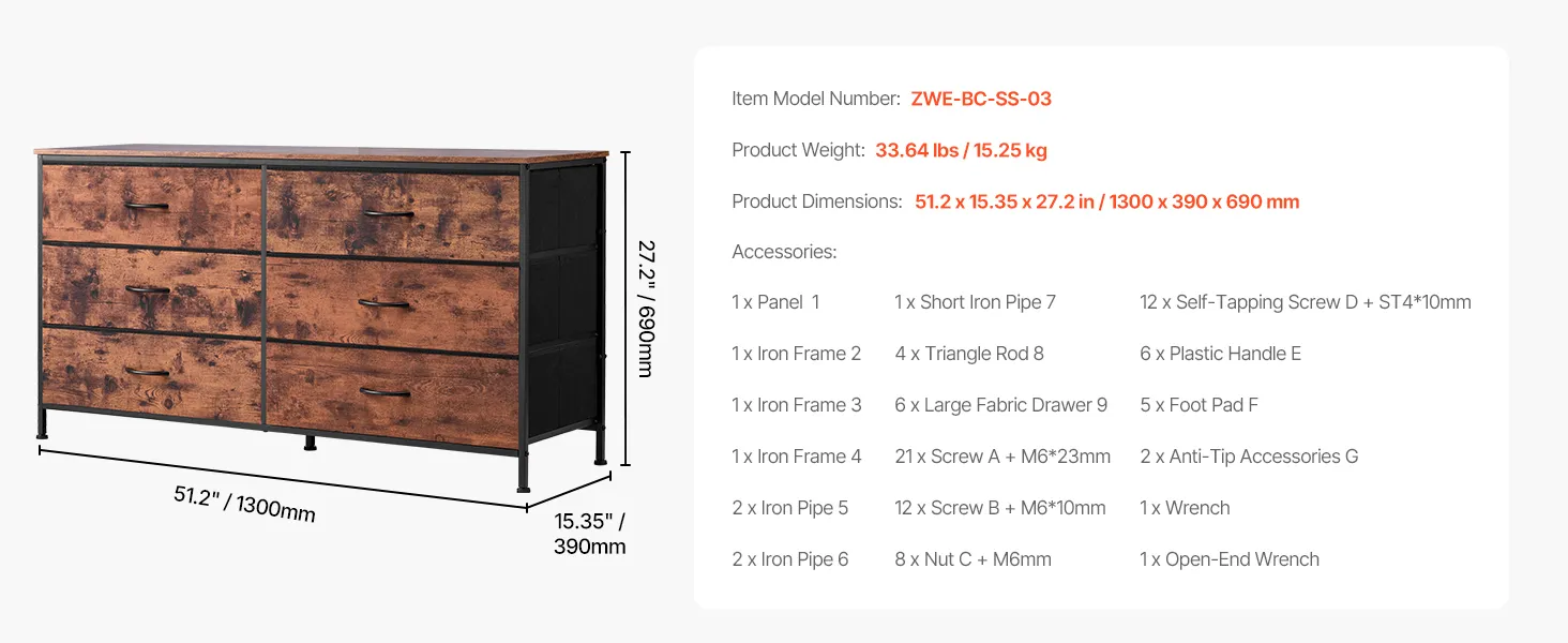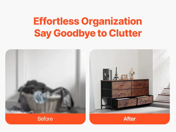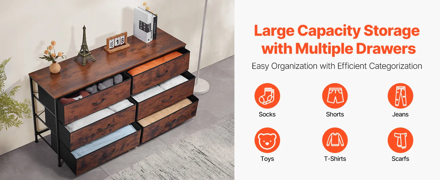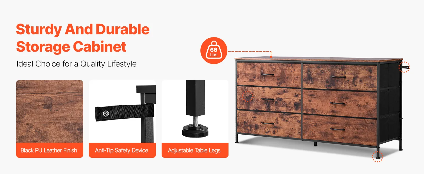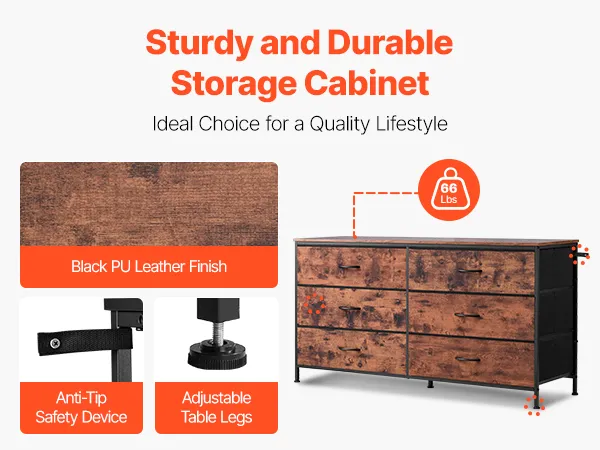 Sturdy and Durable: Built with a robust black metal frame, our drawer dresser ensures reliable support for your belongings. The anti-tip feature adds an extra layer of security, giving you peace of mind when storing your cherished items.