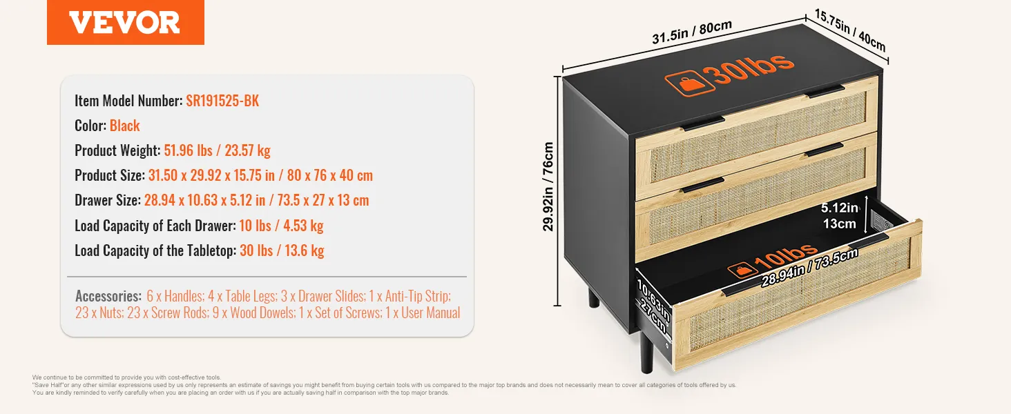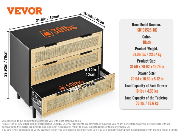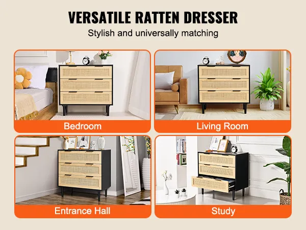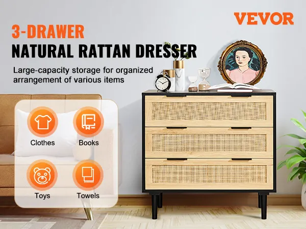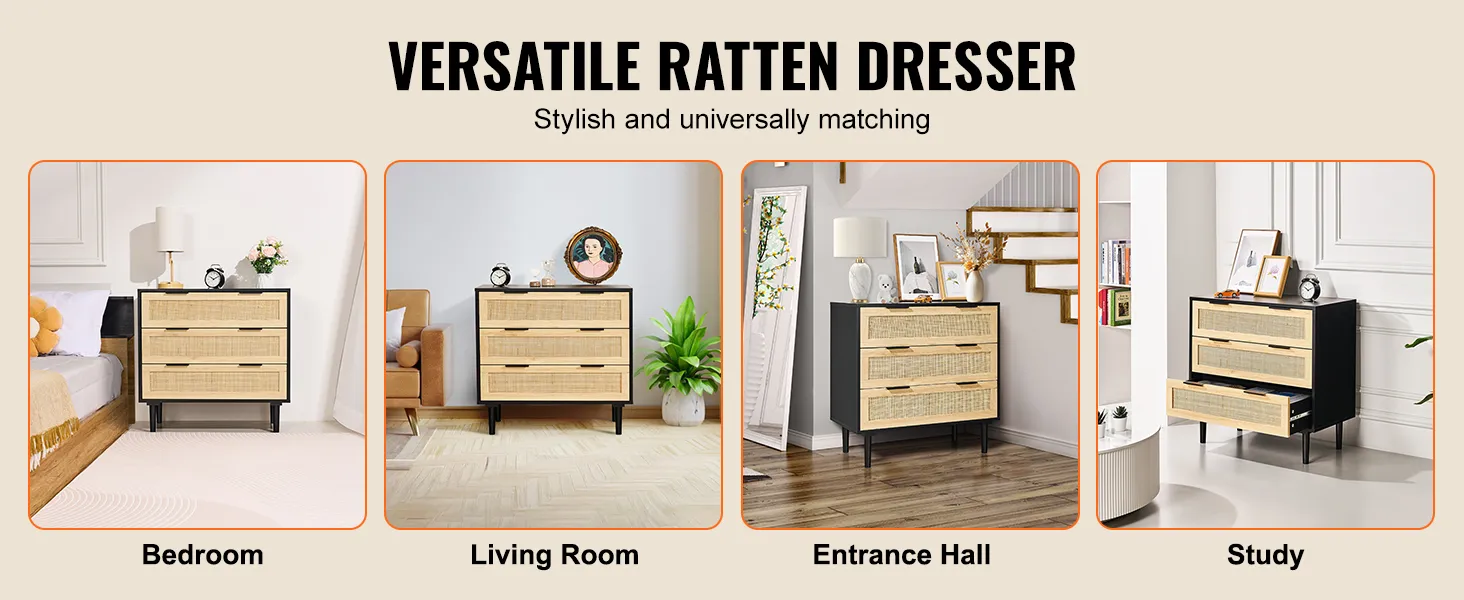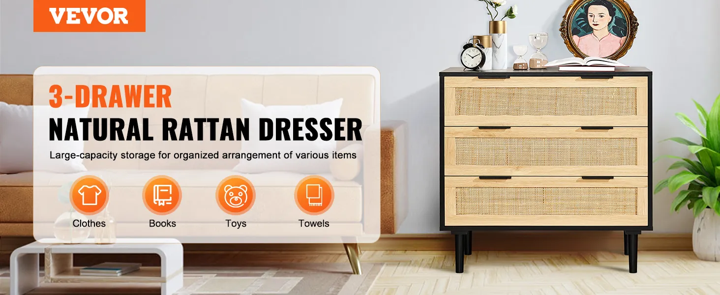 The VEVOR rattan dresser combines rattan with sturdy wood to organize your items. Versatile for any room, it works as a dressing table, nightstand, TV stand, or entryway table, adding charm and practicality to your home!