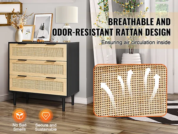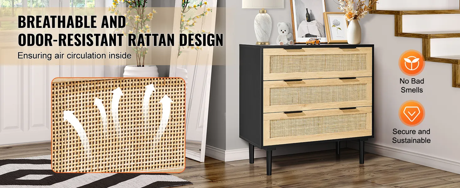Quality Material: Made with natural rattan and sustainable particleboard, this rattan dresser for bedroom promotes a healthier home. Its breathable design ensures no unpleasant smells, while the durable frame is scratch-resistant, waterproof, and easy to clean - built to last!