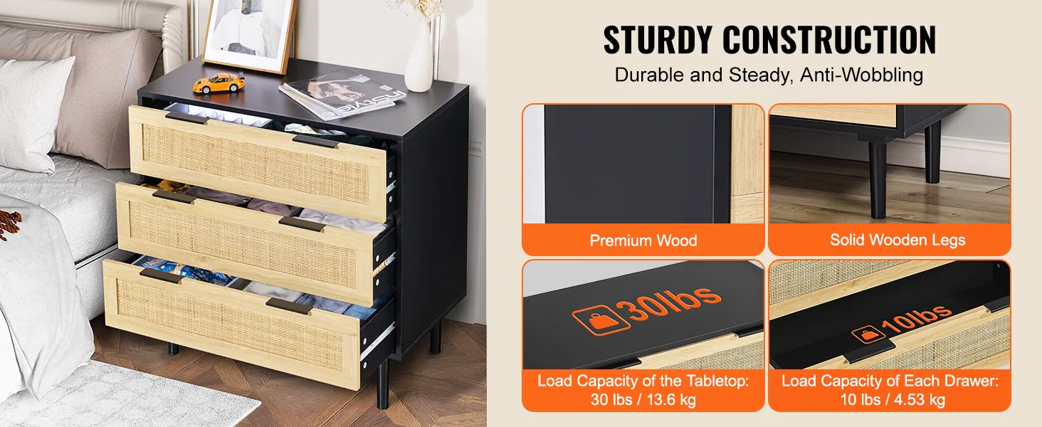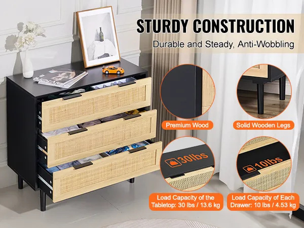 Large Storage Capacity: This rattan dresser features three roomy drawers, ideal for organizing your space. Whether in your bedroom, living room, or hallway, it’s a chic addition that holds up to 10 lbs per drawer and 30 lbs on top - ideal for everyday use.