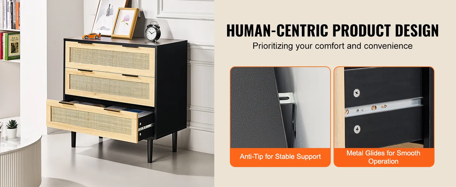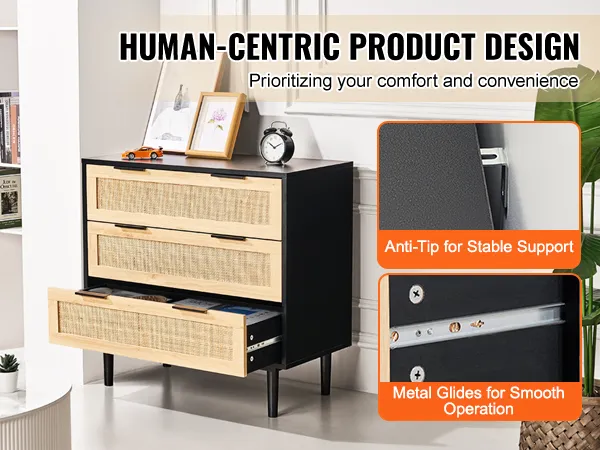 This rattan dresser for bedroom is designed with your comfort in mind. The anti-tip device offers reliable support, and the metal sliders on each drawer ensure smooth and quiet opening and closing, making it a user-friendly addition to your home.