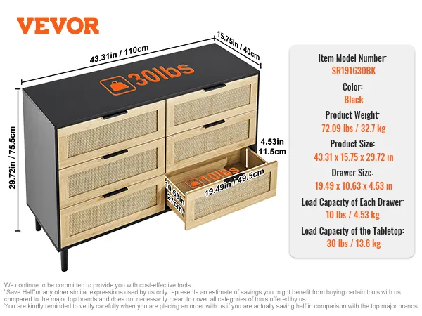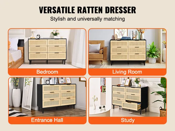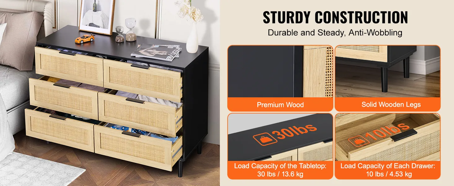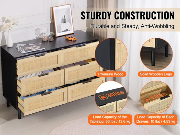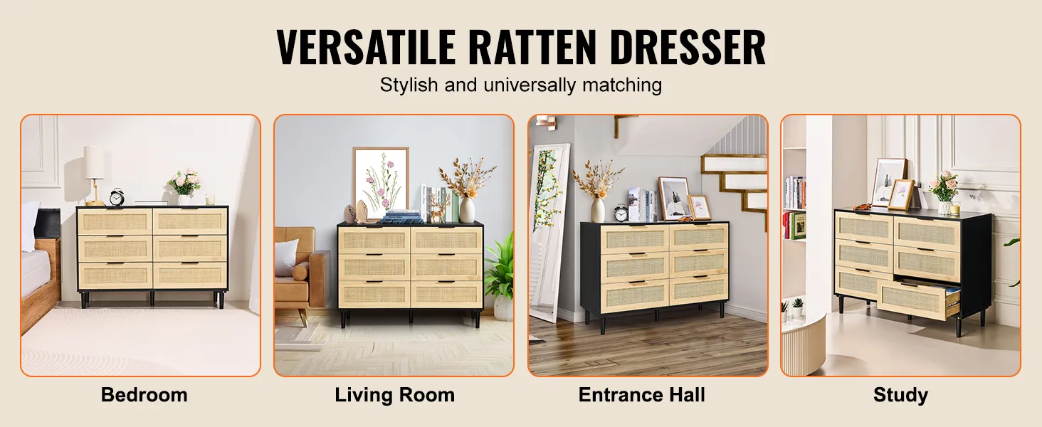 Veel opbergruimte: deze rotan ladekast heeft zes ruime lades waarmee je je ruimte optimaal kunt indelen. Of het nu in de slaapkamer, woonkamer of gang is, het is een stijlvolle toevoeging die tot 4,53 kg (10 lbs) per lade en 13,6 kg (30 lbs) in totaal kan dragen - ideaal voor dagelijks gebruik.