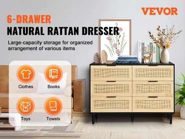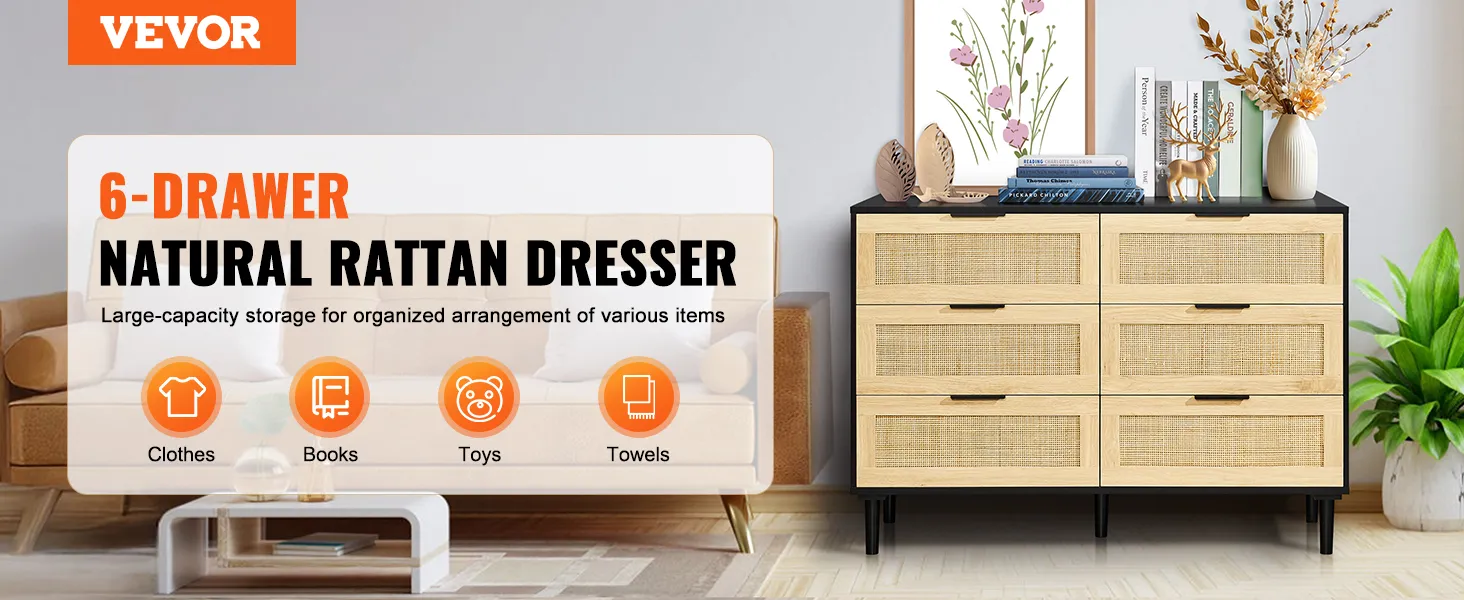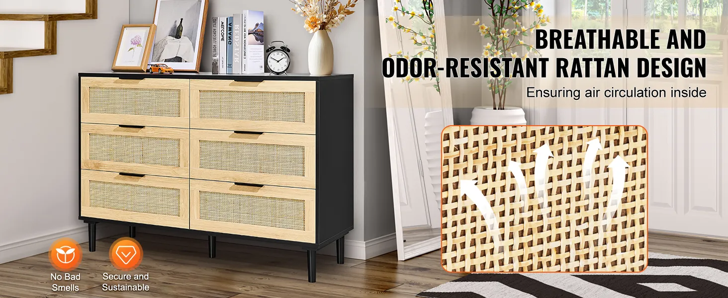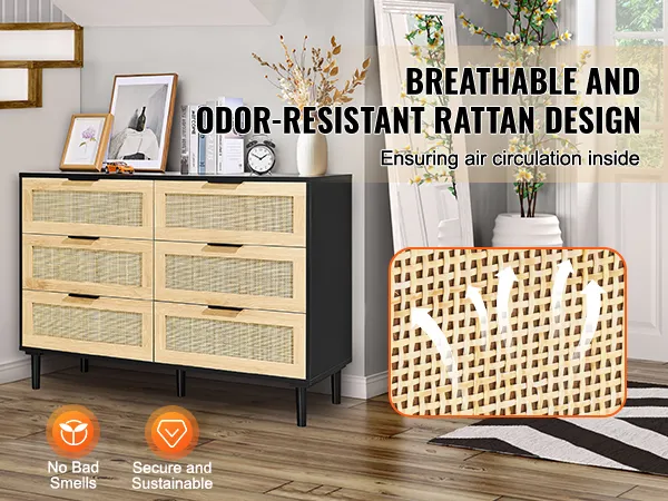 VEVOR Rotan Dressoir met 6 Laden, Natuurlijke Rotan Dressoir met 6 Laden, Moderne Houten Dressoir, Kledingorganizer en Opbergruimte, Boho Dressoir met Stevige Handgrepen en Poten, voor Slaapkamer, Woonkamer en Gang