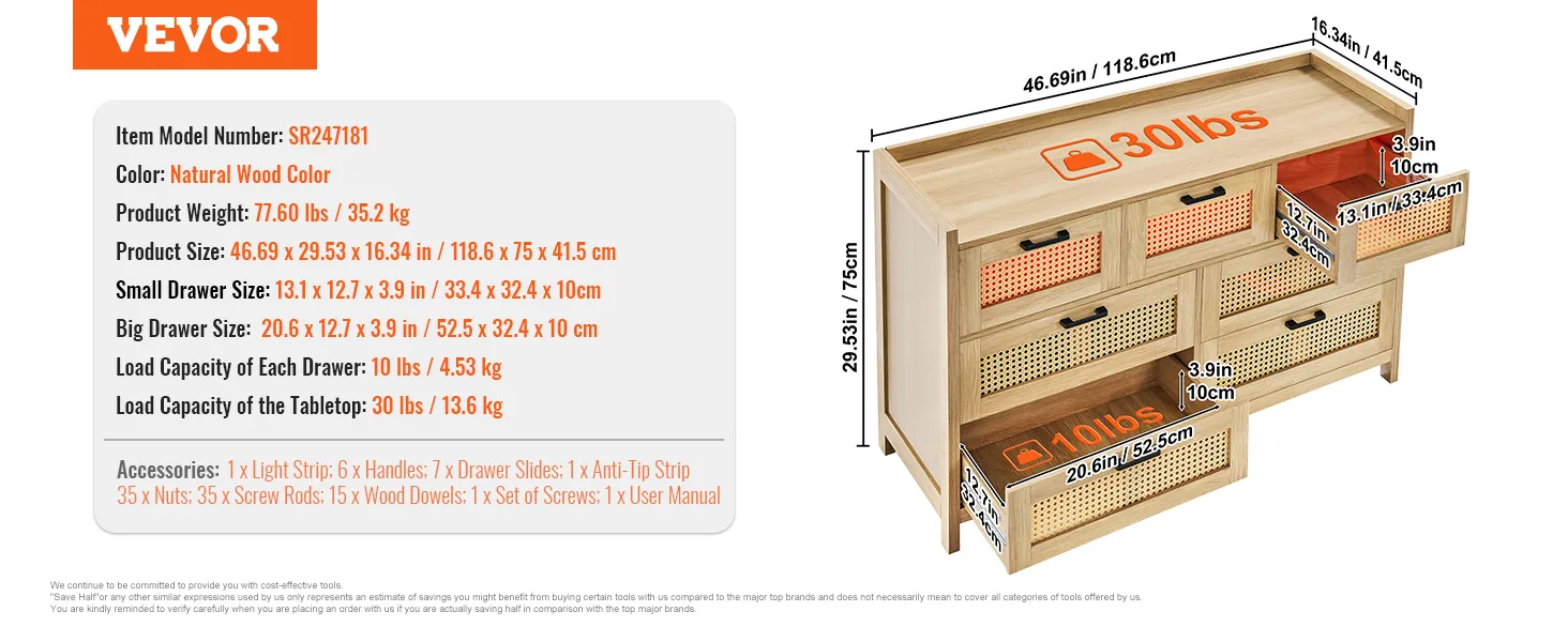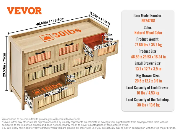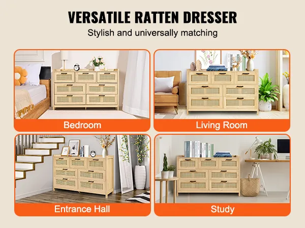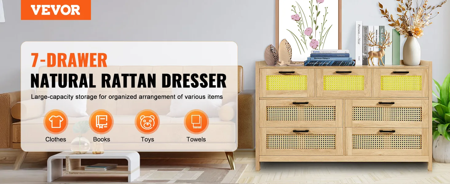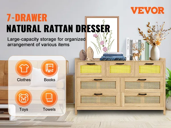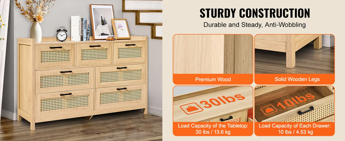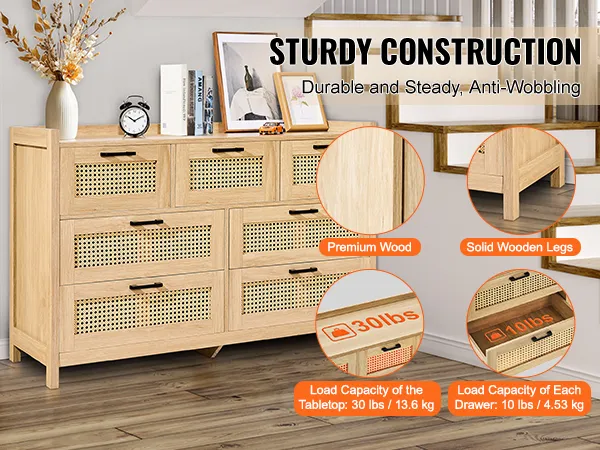 Large Storage Capacity: This rattan dresser features seven roomy drawers, ideal for organizing your space. Whether in your bedroom, living room, or hallway, it’s a chic addition that holds up to 10 lbs per drawer and 30 lbs on top - ideal for everyday use.
