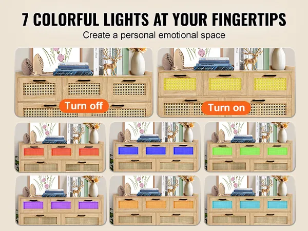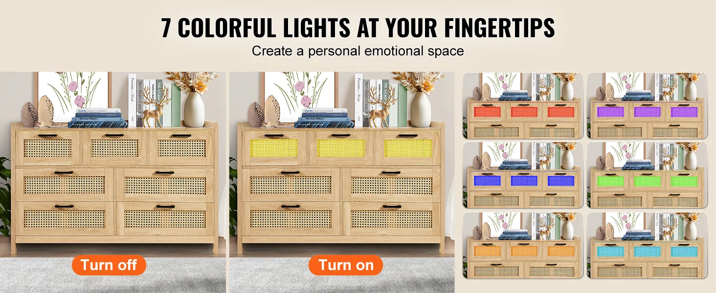 This rattan dresser comes with seven vibrant light options, letting you effortlessly create a cozy and romantic vibe in your bedroom. Enjoy the emotional warmth it brings, even in low light!