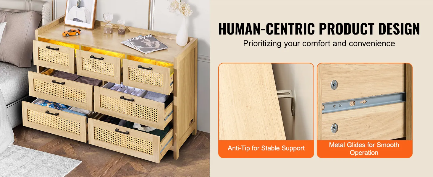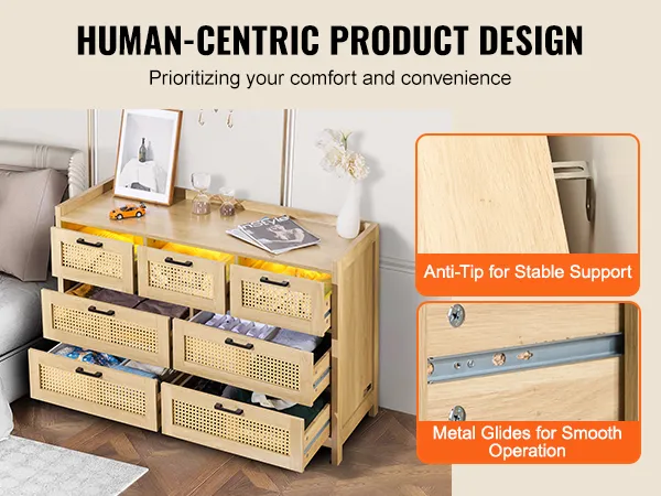 This rattan dresser for bedroom is designed with your comfort in mind. The anti-tip device offers reliable support, and the metal sliders on each drawer ensure smooth and quiet opening and closing, making it a user-friendly addition to your home.