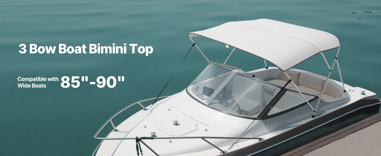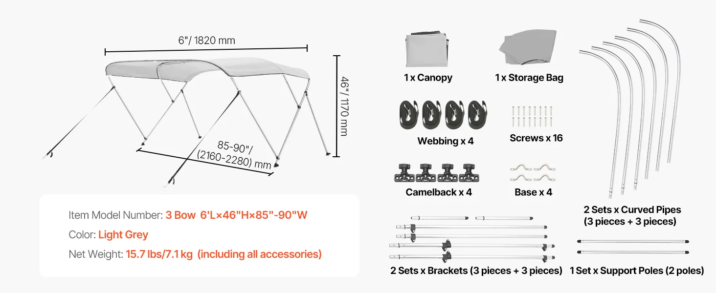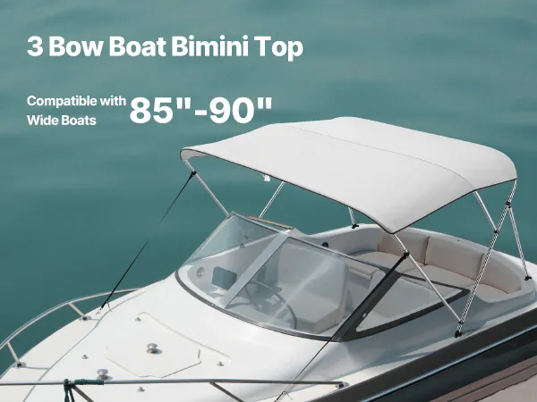 Kies uw ideale formaat: Verkrijgbaar in verschillende formaten, waaronder 3 vellen (L x B x H) 72 x 85-90 x 46 inch (182,88 x 215,9-228,6 x 116,84 cm). Meet eenvoudig de breedte van het dek van uw boot en kies de juiste luifel