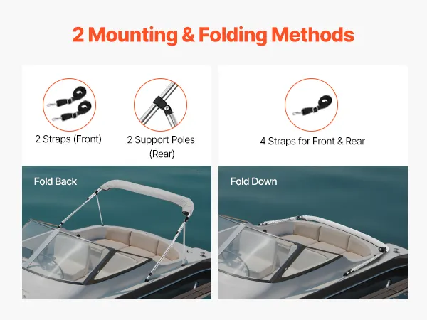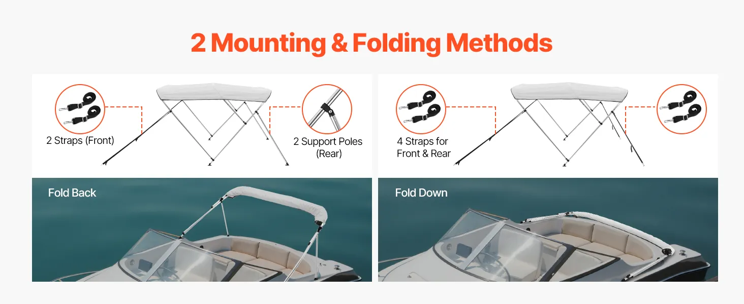 U kunt kiezen uit twee montagemethoden om de luifel aan uw boot te bevestigen. Je kunt hem zowel naar beneden als naar achteren vouwen. Dankzij de meegeleverde banden met snelsluitingen is de montage snel en eenvoudig.