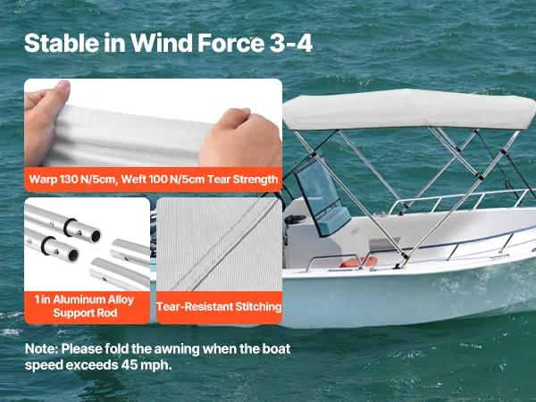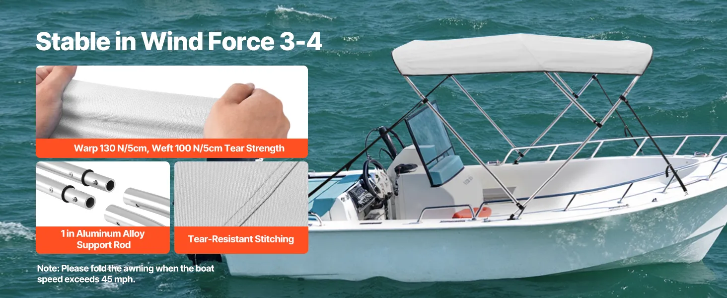 Windbestendig tot 72,42 km/u: deze biminitop voor boten is ontworpen voor windsnelheden tot categorie 3-4 en is voorzien van stevige aluminium palen van 25,4 mm dik voor een goede grip. U hoeft zich geen zorgen meer te maken dat de boot omvalt of gaat slingeren bij harde wind. Tip: Als uw boot sneller vaart dan 72,42 km/u, kunt u de kap uit veiligheidsoverwegingen eenvoudig inklappen.