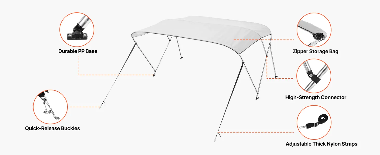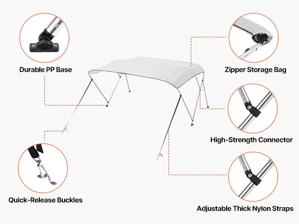 Deze biminitop voor boten is voorzien van 25,4 mm dikke steunpalen van aluminiumlegering en een stevige PP-basis voor veilige bevestiging aan uw boot. De roestbestendige materialen zorgen ervoor dat het product niet corrodeert door zeewater of regen.