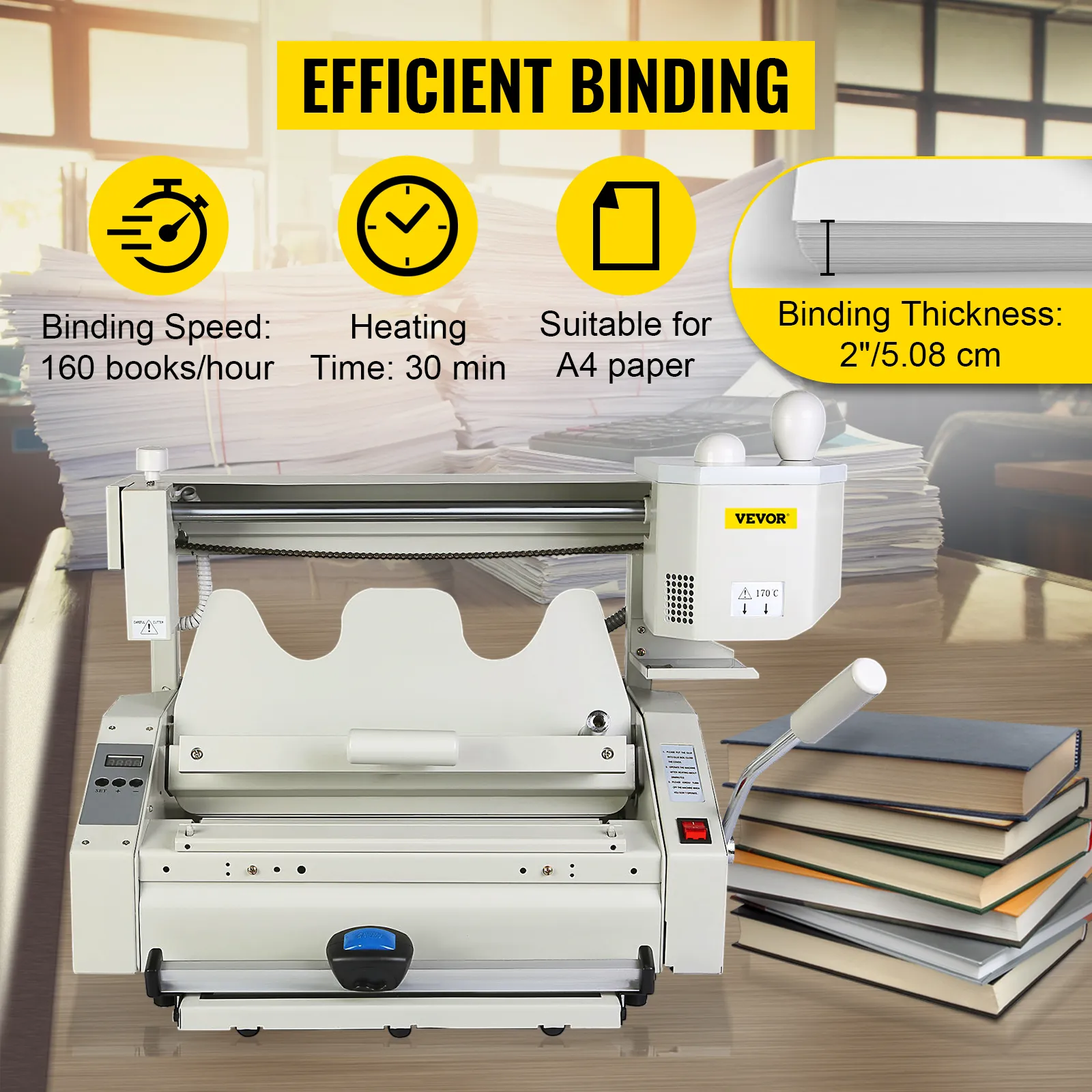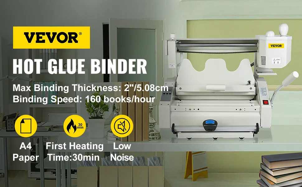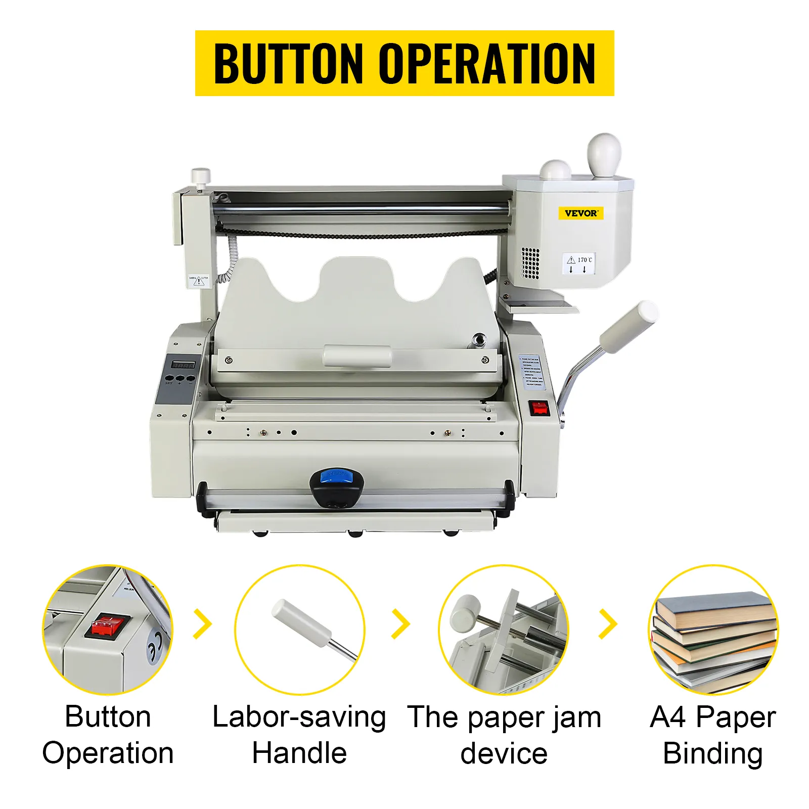 This bookbinder machine is suitable for small and medium-sized print and copy store, binding business, office, library, research institute, and the publishing industry.