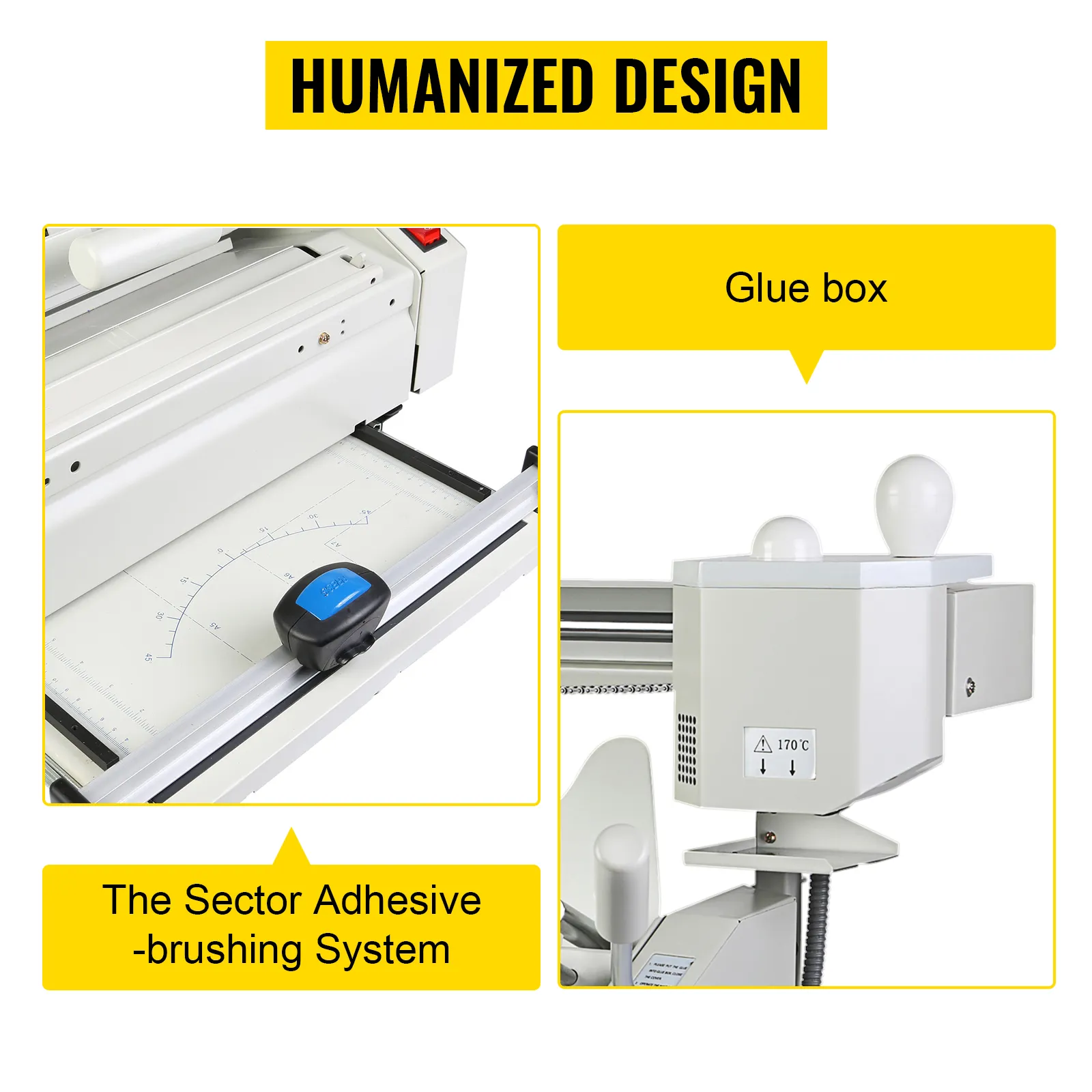 The glue book binding machine features a reinforced body and a manually-operated, electric-driven milling cutter for increased security.