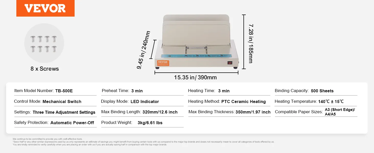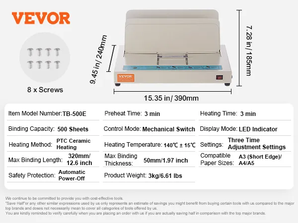 VEVOR Thermische Bindmachine, Boekbindmachine met een capaciteit van 500 vel, Thermische Boekbinder 50 mm Binddikte voor A3 (Korte Zijde)/A4/A5 Documenten, met Optische Infrarooddetectie