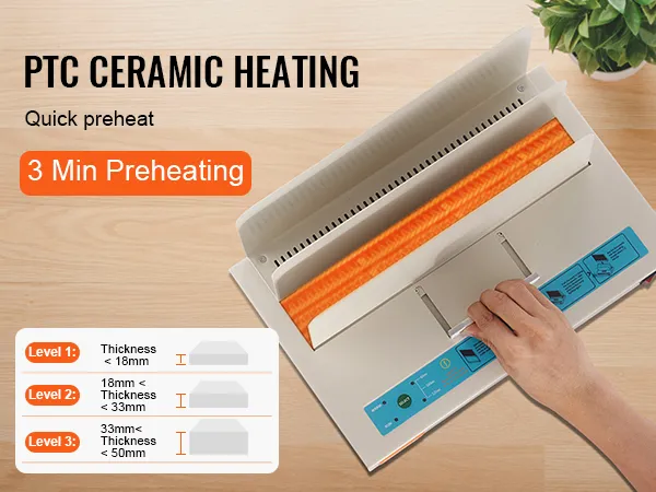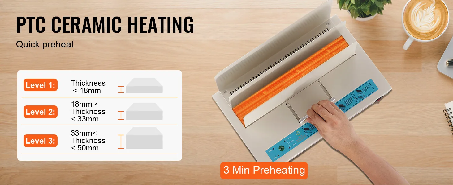 Tijdbesparende werking: Uitgerust met PTC keramische verwarmingstechnologie die een hoge temperatuur van 140°C bereikt. Het voorverwarmen duurt slechts 3 minuten, waardoor je documenten snel inbindt. Drie instelbare tijdsinstellingen voldoen aan verschillende diktevereisten.