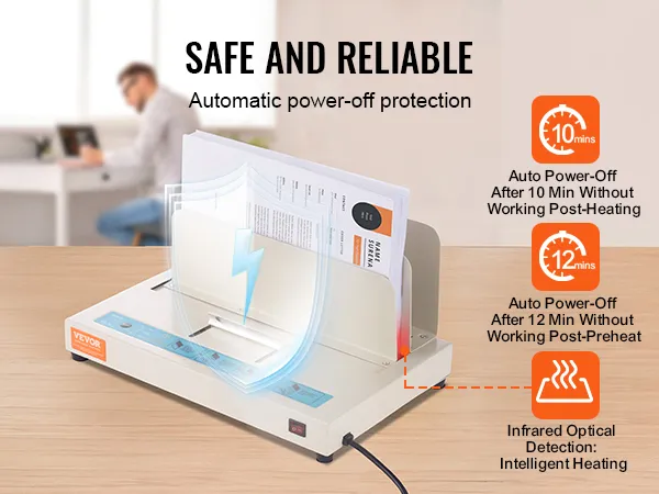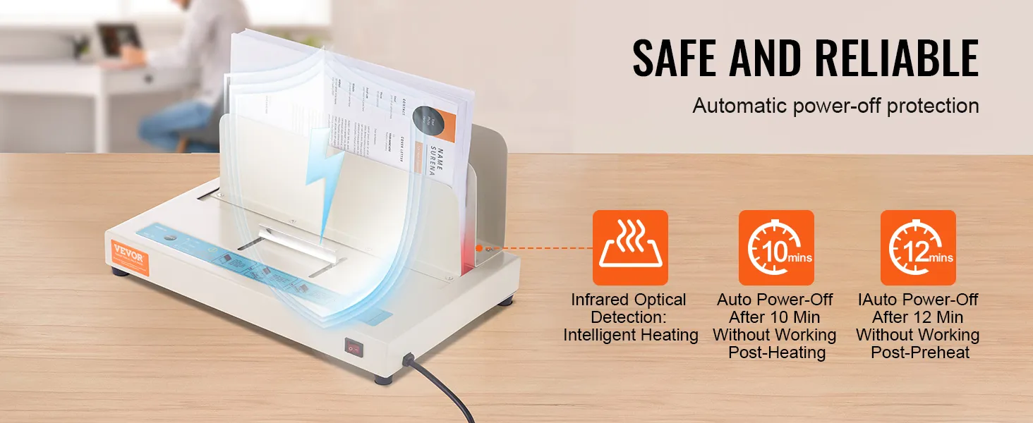 Onze thermische boekbinder wordt automatisch uitgeschakeld na 10 minuten inactiviteit en 12 minuten na het voorverwarmen om veilig gebruik te garanderen.