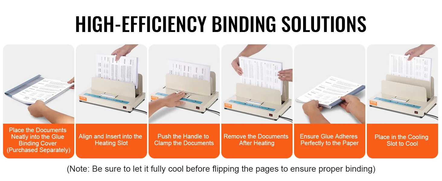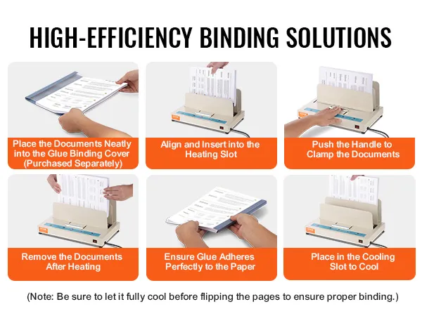 Eenvoudig in gebruik: u hoeft geen gaten te maken, u hoeft slechts één knoop te knopen. De handmatige klemrail voorkomt dat papier eruit valt en de open koelsleuf zorgt voor een snelle afkoeling. Maak het inbinden van documenten veiliger en efficiënter met onze thermische inbindmachine!
