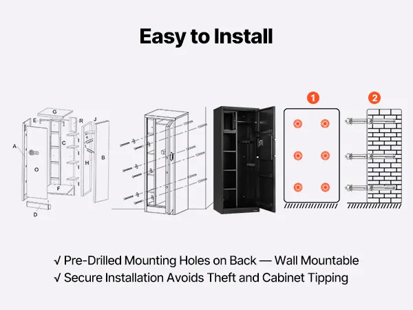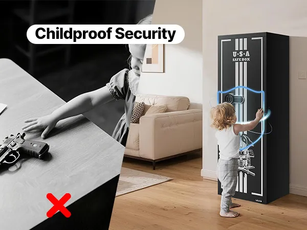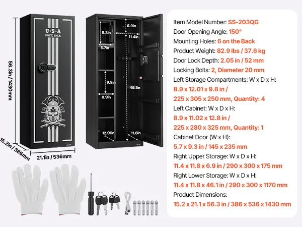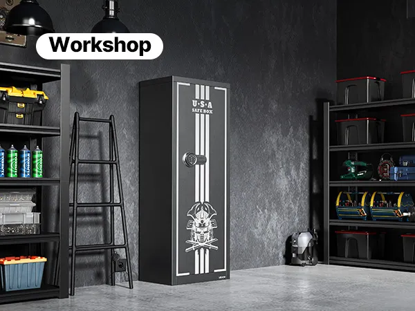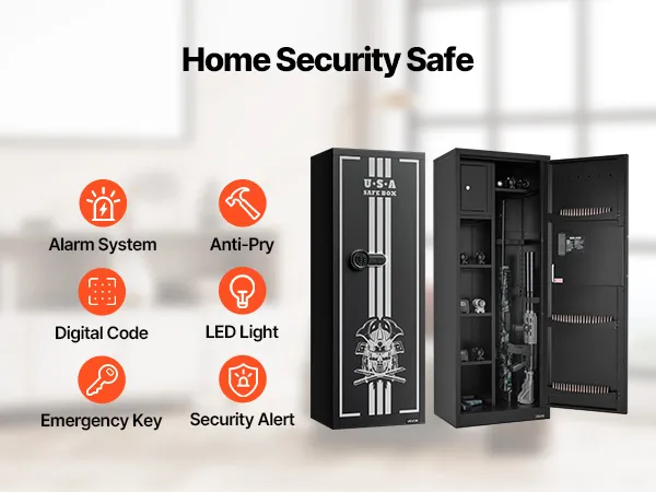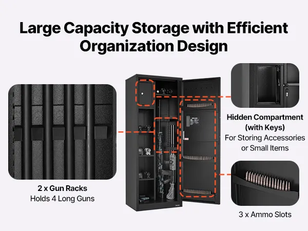 De geweerkluis biedt plaats aan maximaal vier geweren en beschikt over een geheim compartiment voor het opbergen van munitie en andere items, wat voldoet aan de opslagbehoeften van verzamelaars en wapenbezitters. De kluis beschikt ook over verstelbare rekken voor vuurwapens van verschillende lengtes.