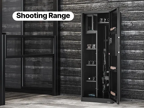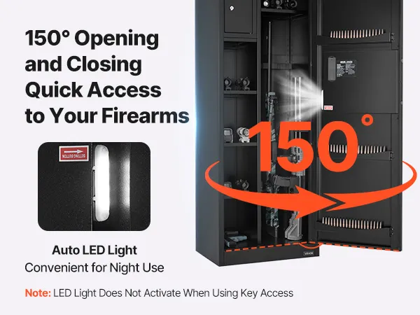 Snelle toegang: De 150° brede deur opent volledig en biedt een duidelijk zicht op alle vuurwapens. Zo kunt u uw wapens snel en gemakkelijk verwijderen. Het interieur is voorzien van automatische ledverlichting voor zichtbaarheid, zelfs bij weinig licht.