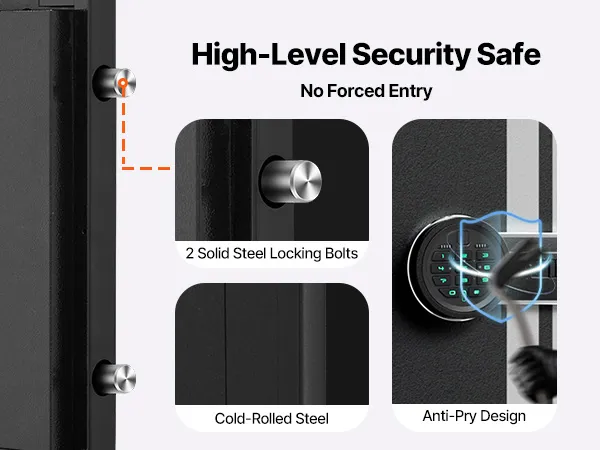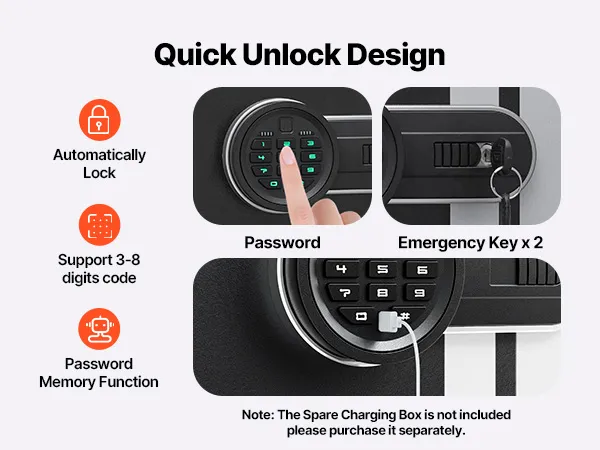 Smart Lock: Het 9-cijferige touchscreen-wachtwoordslot biedt snelle toegang. Het wachtwoord kan 3 tot 8 cijfers lang zijn, met een automatische vergrendelingsfunctie voor extra beveiliging. Ook inbegrepen zijn een noodsleutel en een reserve-oplaadcase voor eenvoudig ontgrendelen wanneer de batterij leeg is. (Let op: Batterij is niet inbegrepen. U dient 4 AA-batterijen apart aan te schaffen.)