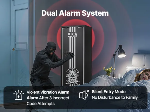 Alarmsysteem en stille modus: Het systeem activeert automatisch een alarm als er drie keer een verkeerd wachtwoord wordt ingevoerd of als de wapenkluis beschadigd raakt. Om de stille modus te activeren, voert u 11# in. Zo heeft u zelfs 's nachts of onder bijzondere omstandigheden toegang tot uw wapens.