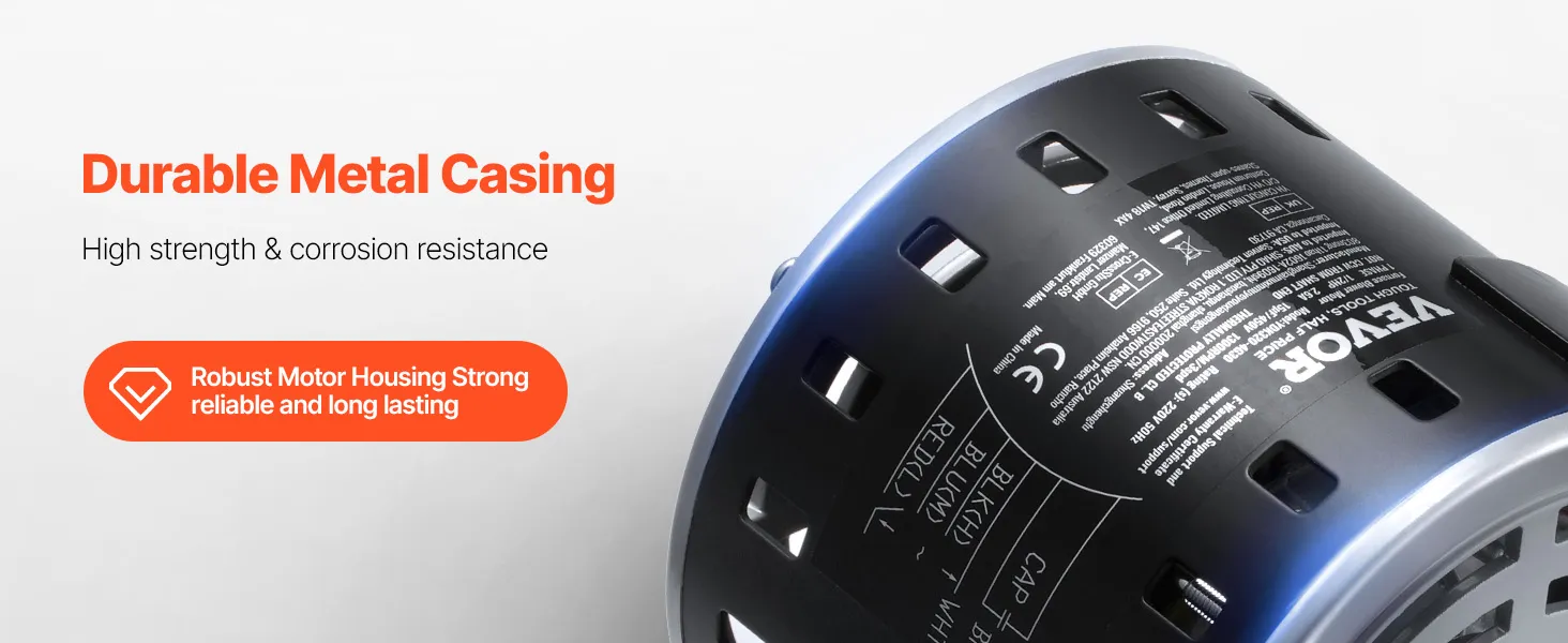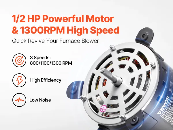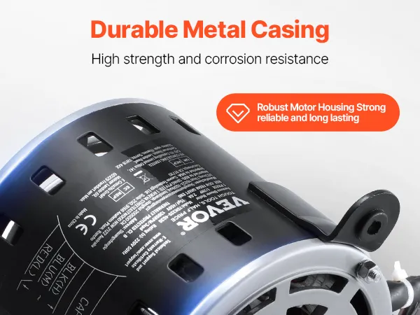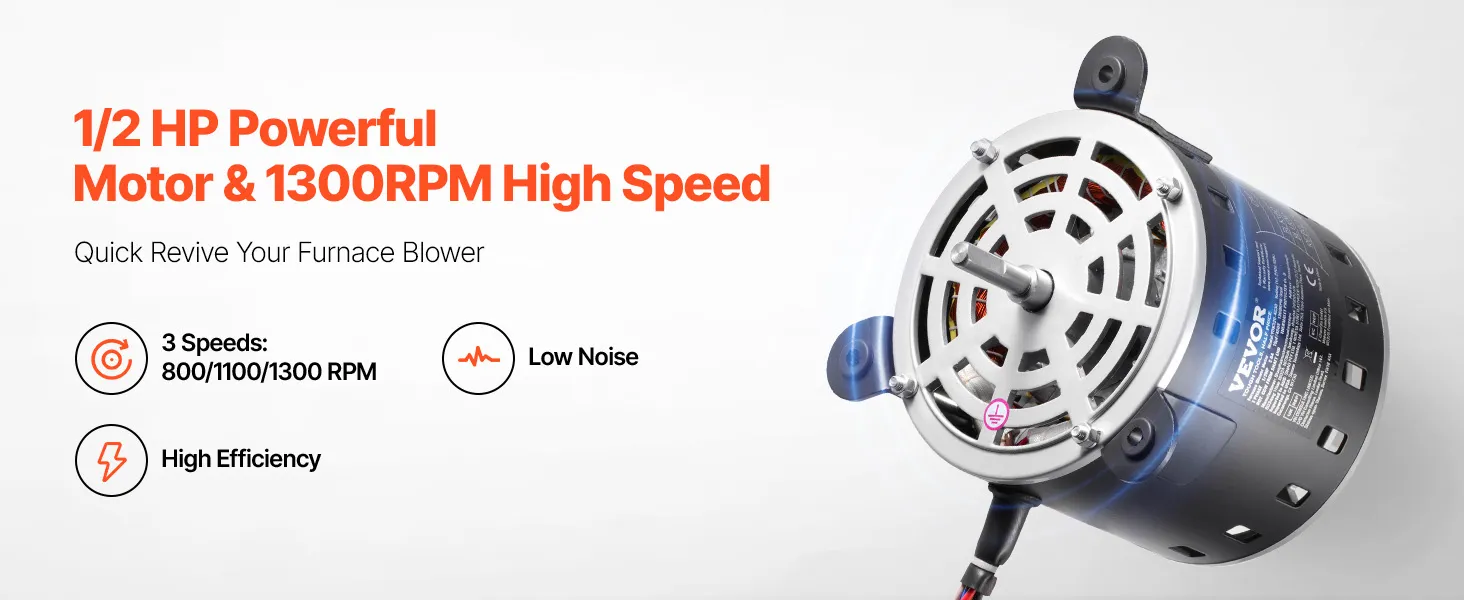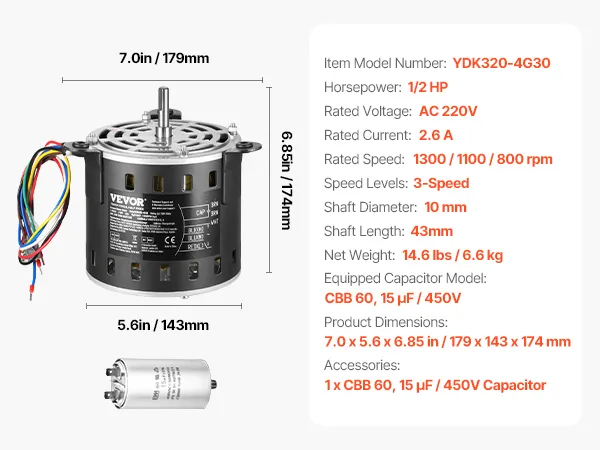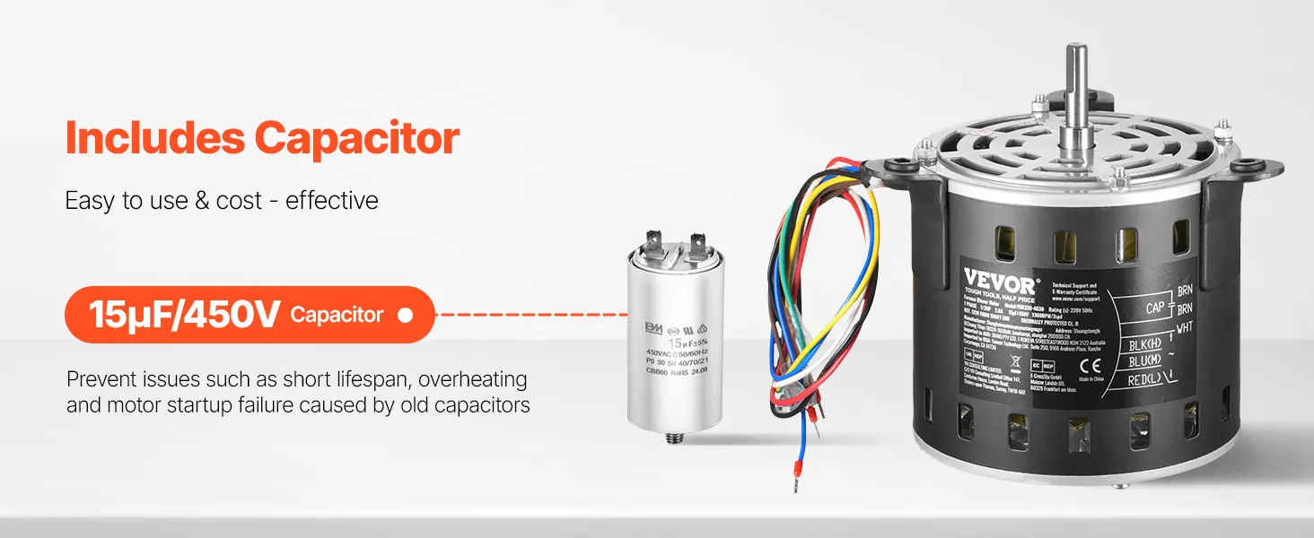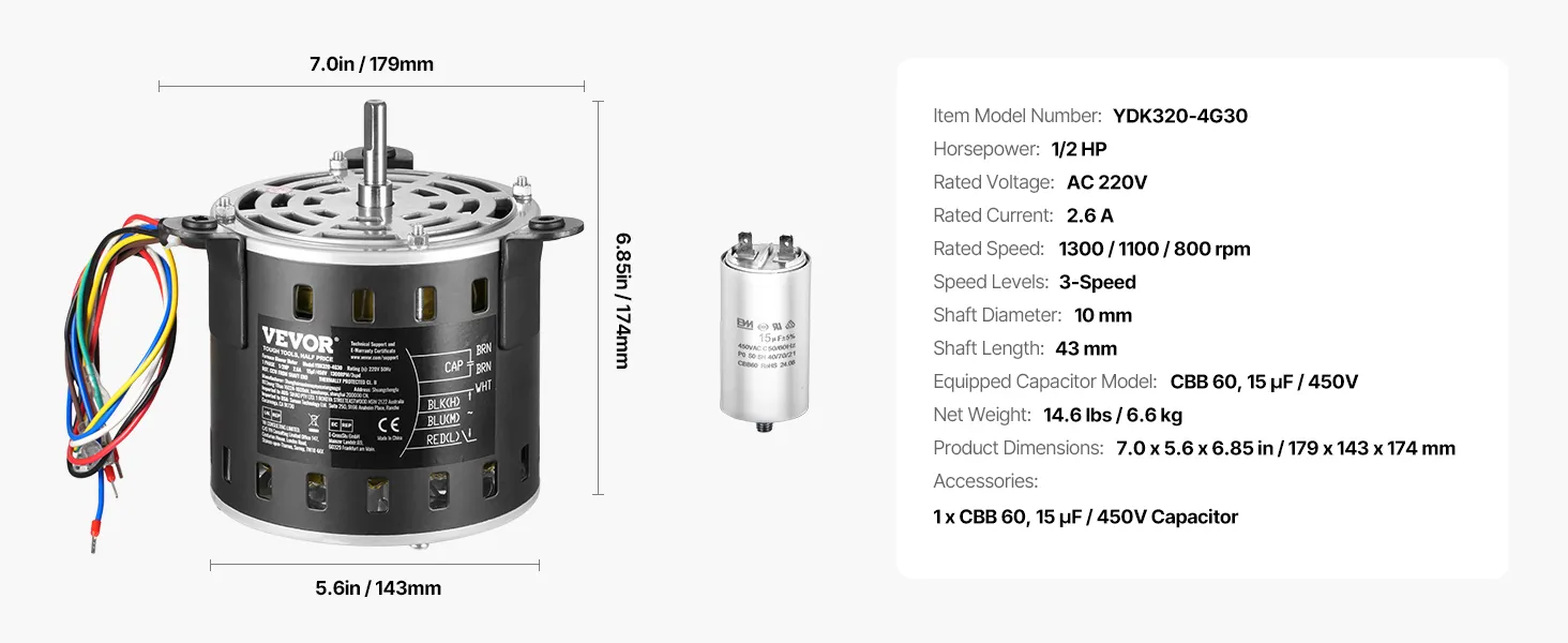 De VEVOR 1/2 PK ventilatormotor (3 snelheden: 1300, 1100 en 800 tpm) werkt op 220V met 2,6A stroom. Met 20 mm schachtlengte, 10 mm schachtdiameter, ROOD. CCW vanaf het asuiteinde en CBB60 15μF/450V condensator, het is de ideale keuze voor airconditioningkanaalsystemen en ovens.