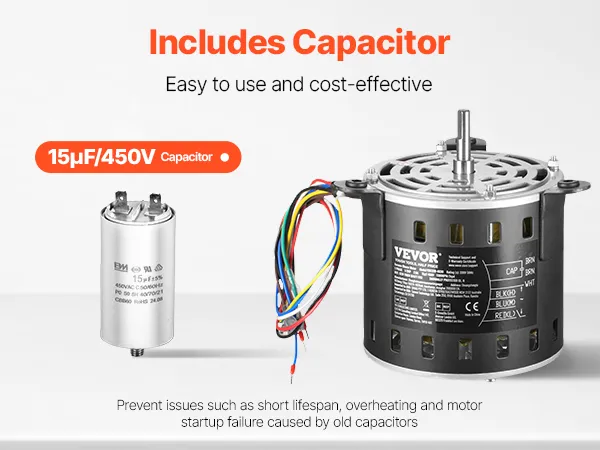 Uitgerust met een extra accessoire (CBB60 15μF/450V condensator), bespaart deze motor u de moeite om compatibele componenten afzonderlijk te zoeken en is hij handiger en klaar voor gebruik!