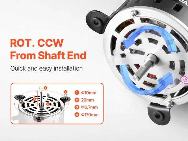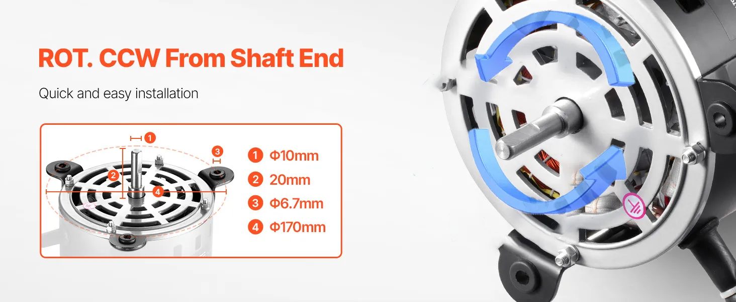Praktische accessoires: Deze ventilatormotor wordt geleverd met een CBB60 15μF/450V condensator, waardoor het niet meer nodig is om compatibele componenten afzonderlijk aan te schaffen. Dit helpt problemen zoals een kortere levensduur, oververhitting en startfouten van de motor als gevolg van veroudering of incompatibele condensatoren te voorkomen