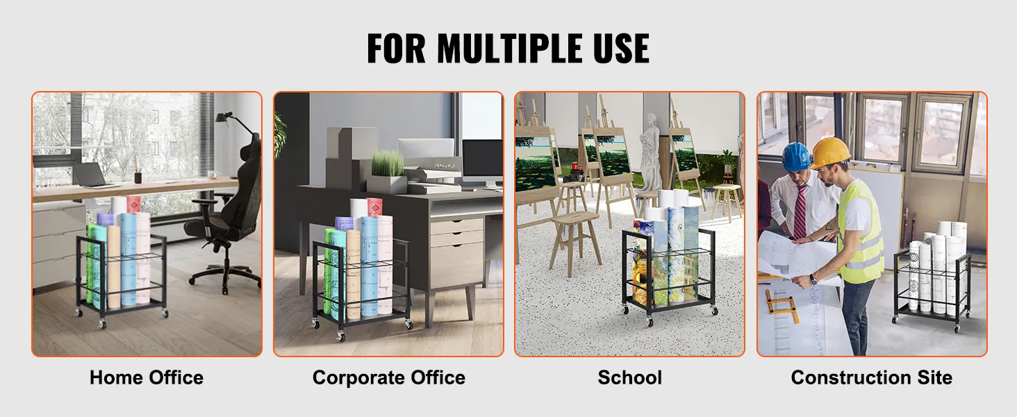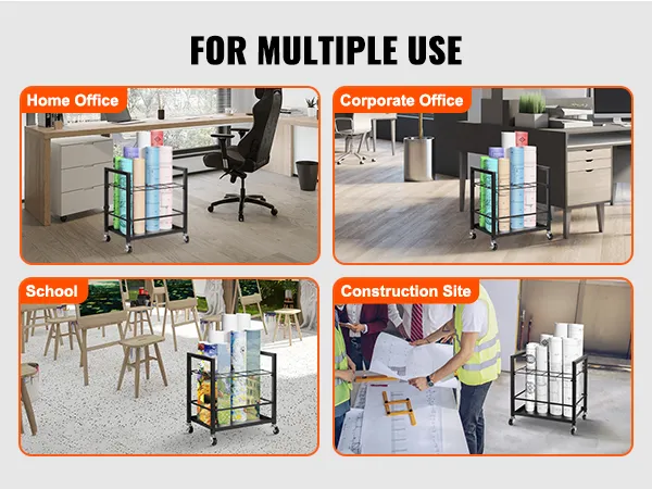 Veel omgevingen kunnen het VEVOR blauwdruk opbergrek gebruiken. Het is geschikt voor een breed scala aan omgevingen, van kantoren tot scholen tot professionele omgevingen. U kunt het ook gebruiken op kantoren, scholen en professionele gebieden. Dit veelzijdige opbergrek is perfect voor het opbergen van kaarten, inpakpapier, enz. De duurzame constructie zorgt ervoor dat het langer meegaat zonder frequent gebruik. Mobiliteitsfuncties zorgen voor eenvoudig transport tussen verschillende locaties. Deze veelzijdigheid maakt het een effectieve opslagoplossing voor verschillende behoeften. Compact ontwerp bespaart ruimte en biedt voldoende opbergruimte. Of het nu voor professioneel of persoonlijk gebruik is, dit rek voldoet effectief aan uw behoeften.