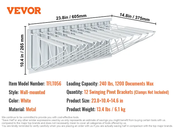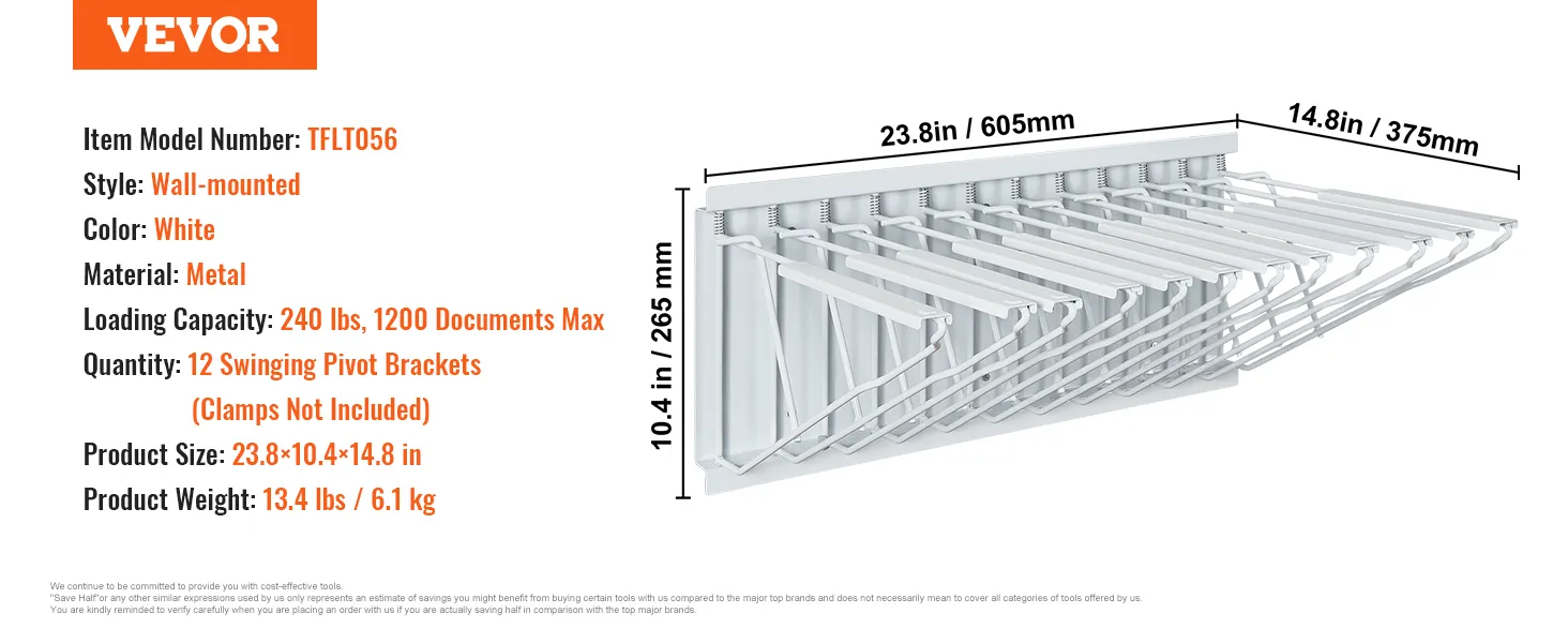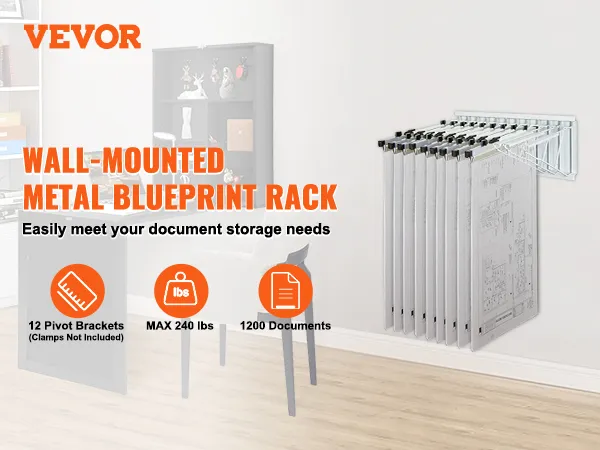 VEVOR Wandgemonteerd opbergrek voor blauwdrukken - Ruimte voor maximaal 1200 blauwdrukken, hangende blauwdrukhouder met 12 draaibare beugels, past op klemmen van 24", 30", 36" of 42" (alleen plank, geen klemmen) - Zwaar (240 lbs)